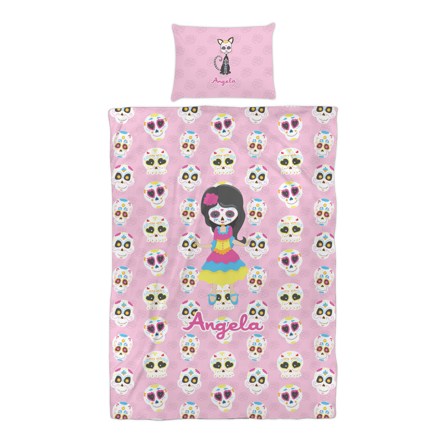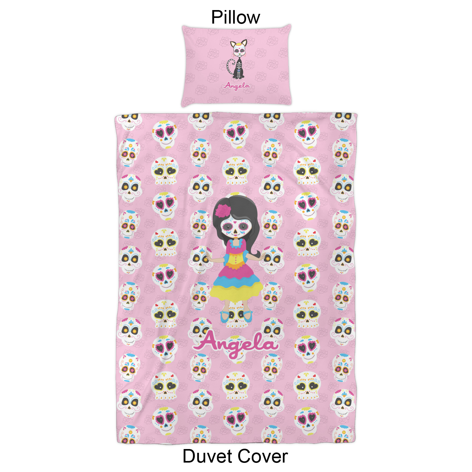 Most sugar skull design are only suitable for adults - not this one! This sugar skulls designs was done especially for kids who love sugar skulls. This is another one of our many layered designs where the background is a coordinating floral pattern; with kid friendly sugar skulls on top. We then topped it off with our girl who has her face painted. For personalization, we added her name to the bottom.