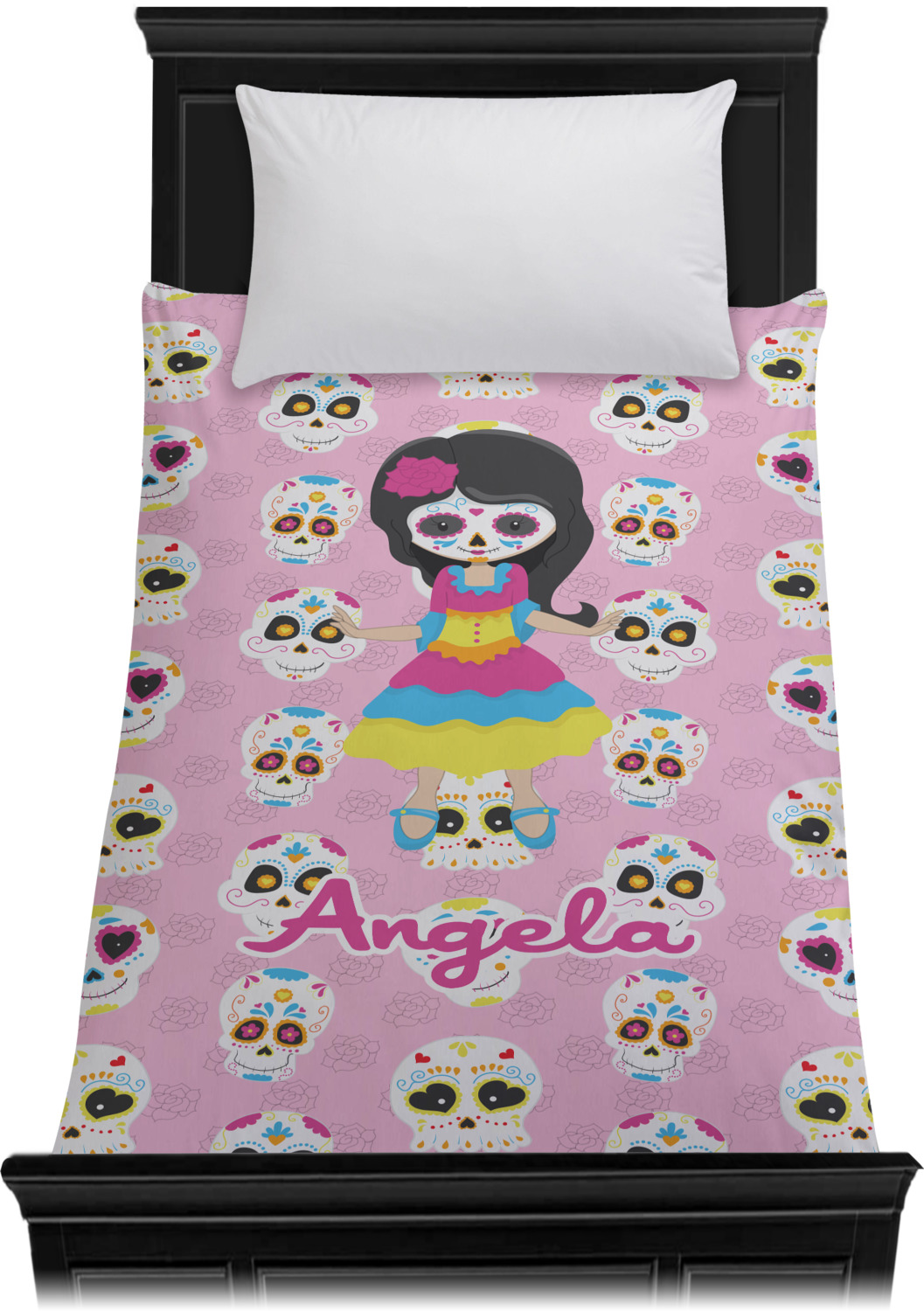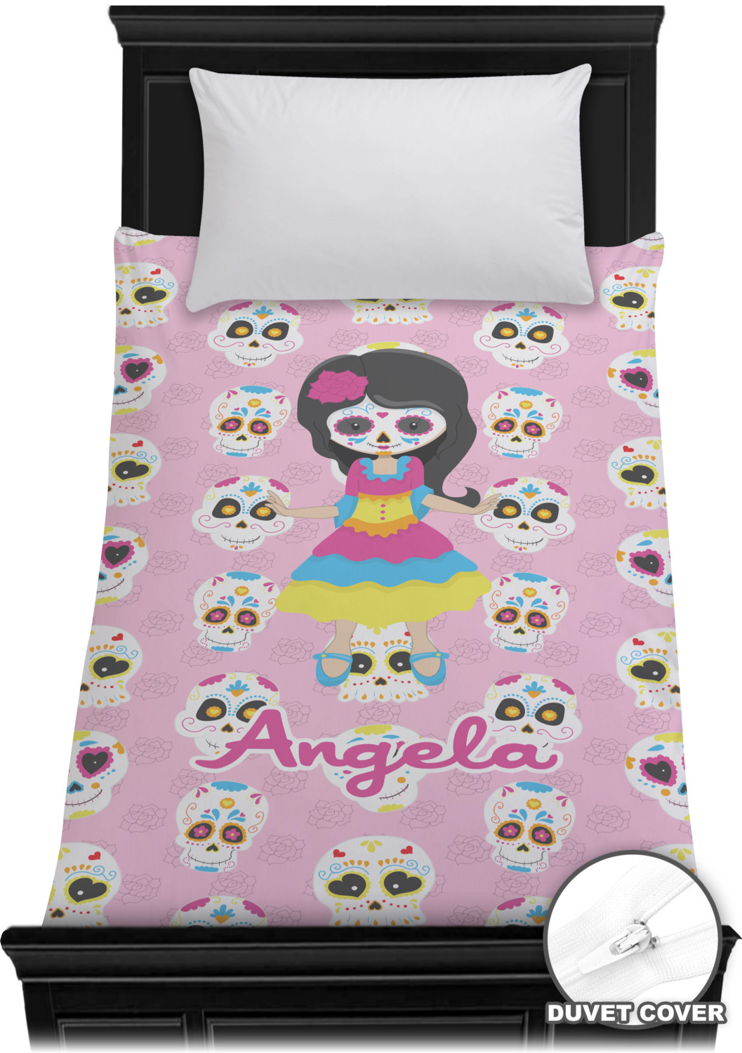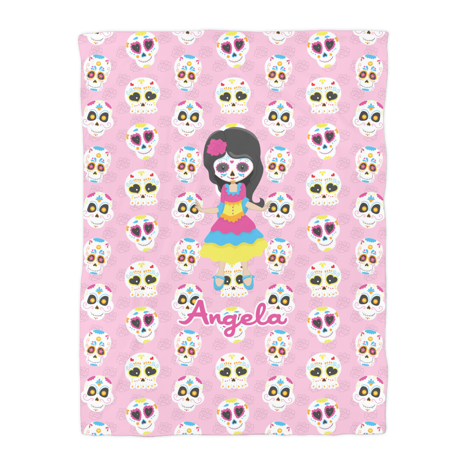 Most sugar skull design are only suitable for adults - not this one! This sugar skulls designs was done especially for kids who love sugar skulls. This is another one of our many layered designs where the background is a coordinating floral pattern; with kid friendly sugar skulls on top. We then topped it off with our girl who has her face painted. For personalization, we added her name to the bottom.