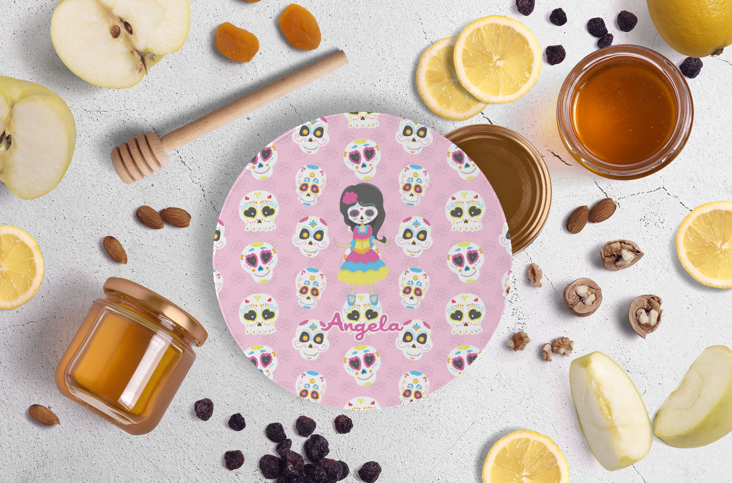 Most sugar skull design are only suitable for adults - not this one! This sugar skulls designs was done especially for kids who love sugar skulls. This is another one of our many layered designs where the background is a coordinating floral pattern; with kid friendly sugar skulls on top. We then topped it off with our girl who has her face painted. For personalization, we added her name to the bottom.