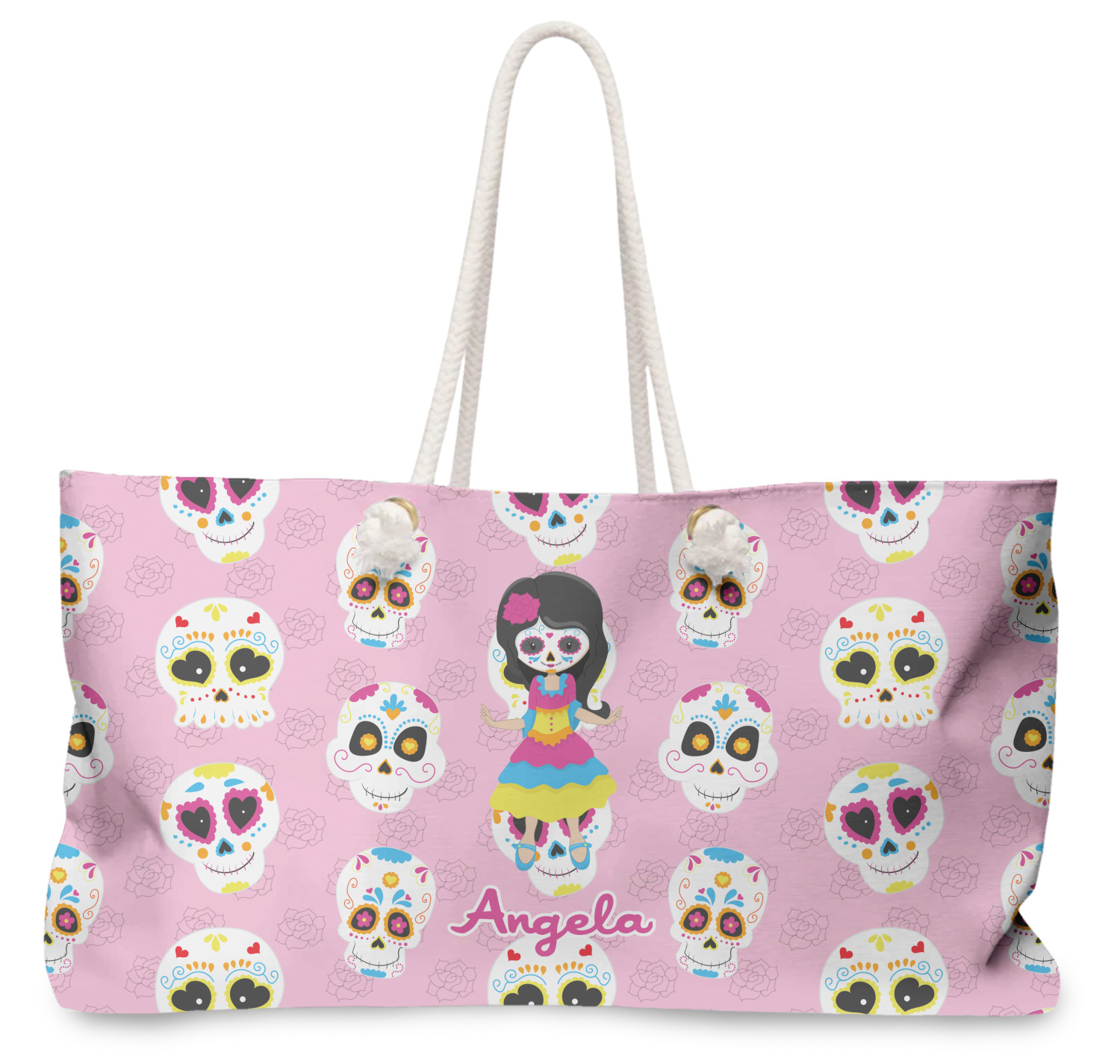 Our oversized weekender tote with rope handles is perfect for your weekend at the beach or on the town. This large tote are 24" W X 13" H, with a 5" gusset and a 27" thick rope handles with a knot that is put through a grommeted brass hole.