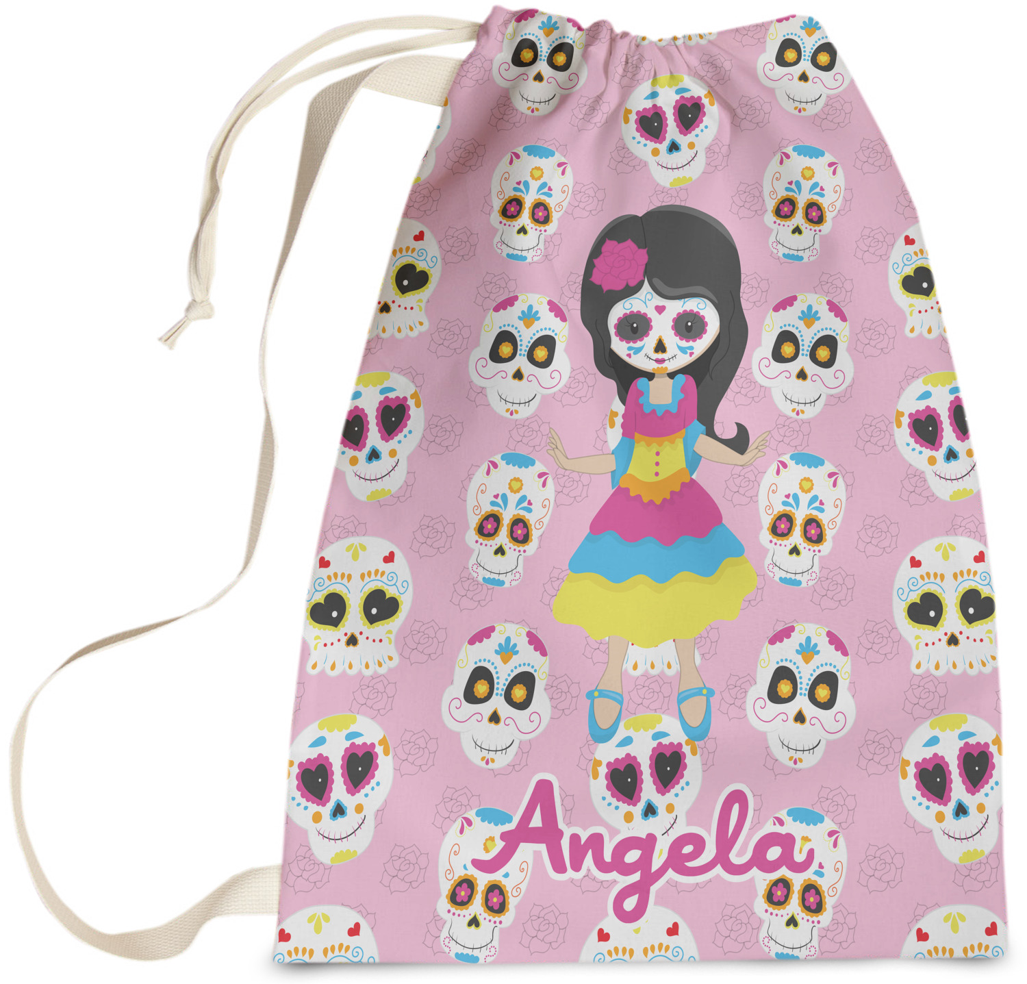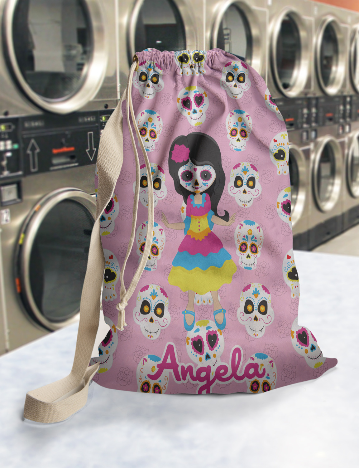 Carry your laundry in style with these customized laundry bags. Available in two sizes, featuring a natural colored woven strap and a cinch cord, these bags hold a lot of clothes or anything else you want to fit in them.