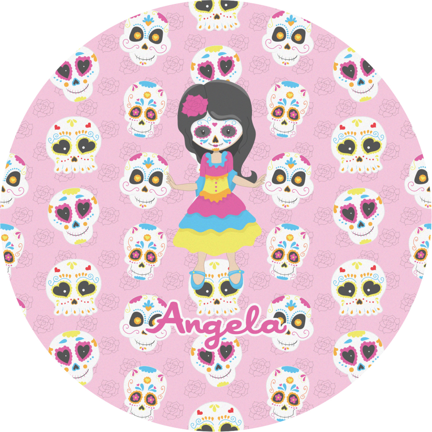 Most sugar skull design are only suitable for adults - not this one! This sugar skulls designs was done especially for kids who love sugar skulls. This is another one of our many layered designs where the background is a coordinating floral pattern; with kid friendly sugar skulls on top. We then topped it off with our girl who has her face painted. For personalization, we added her name to the bottom.
