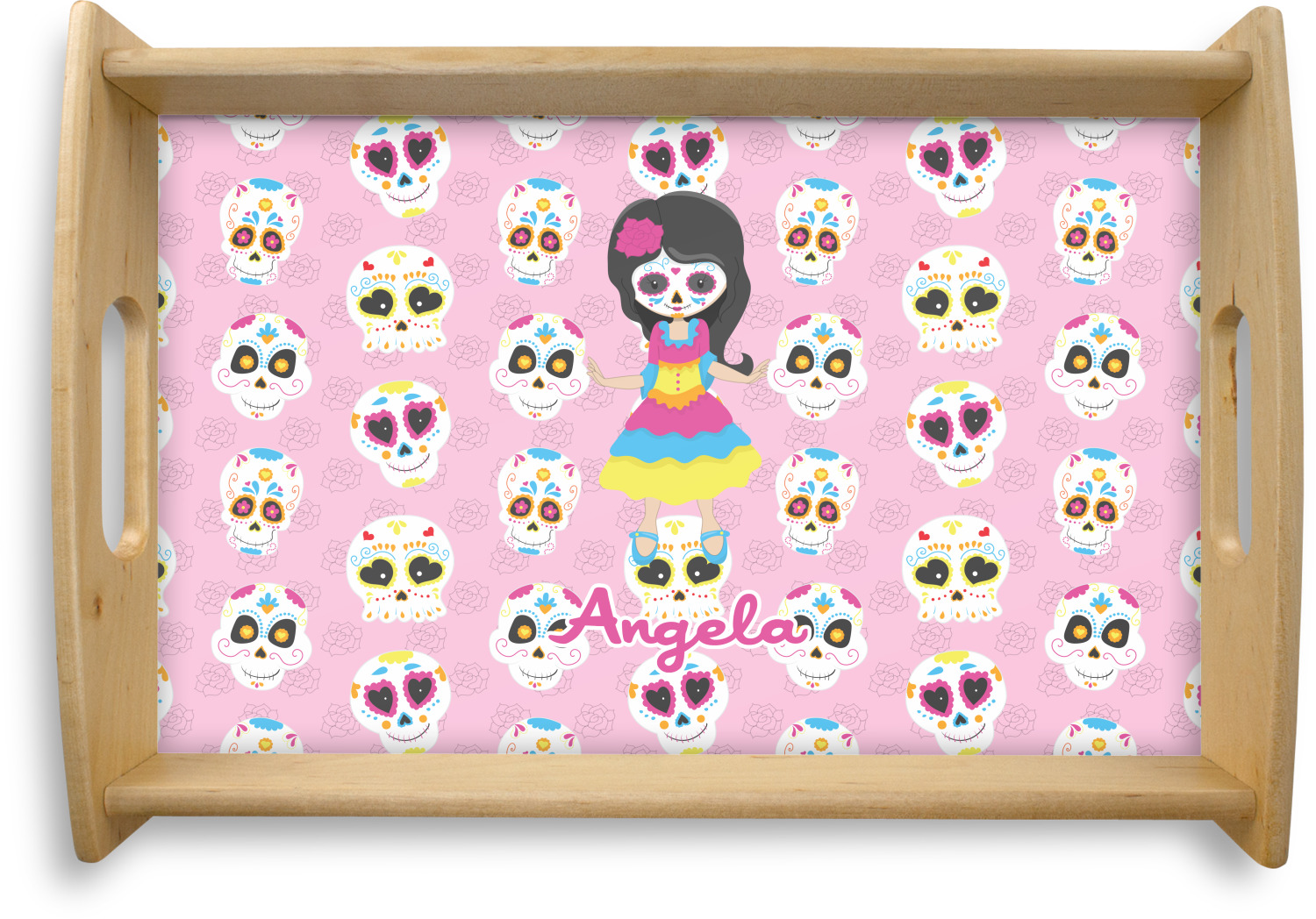 This serving tray with handles features square edges and two rounded sides, creating a very modern look. Each side is fabricated from a beautifully cut, natural wood. The bottom of the interior of the tray displays your customized design in bright, vibrant color. The tray is sold in both a black color and a natural wood look. Each variation of the wood serving tray has two sizes: Small, which is 14" x 10" x 2.25", and Large, which is 19.5" x 13.5" x 2.75".