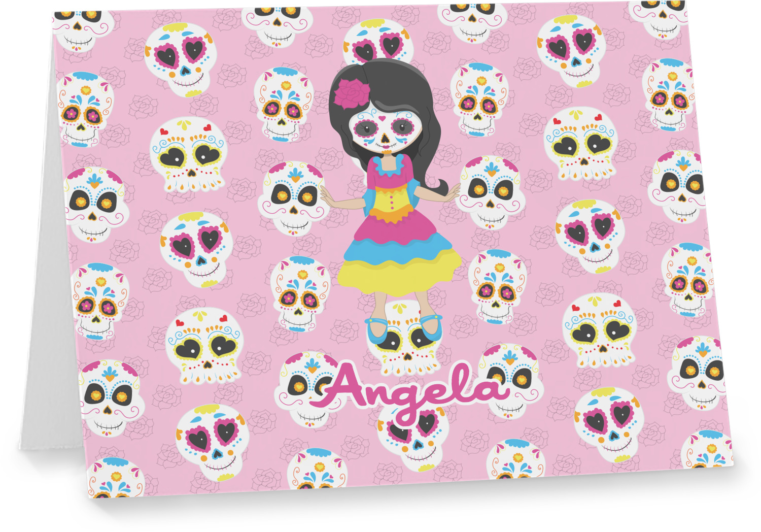 Most sugar skull design are only suitable for adults - not this one! This sugar skulls designs was done especially for kids who love sugar skulls. This is another one of our many layered designs where the background is a coordinating floral pattern; with kid friendly sugar skulls on top. We then topped it off with our girl who has her face painted. For personalization, we added her name to the bottom.