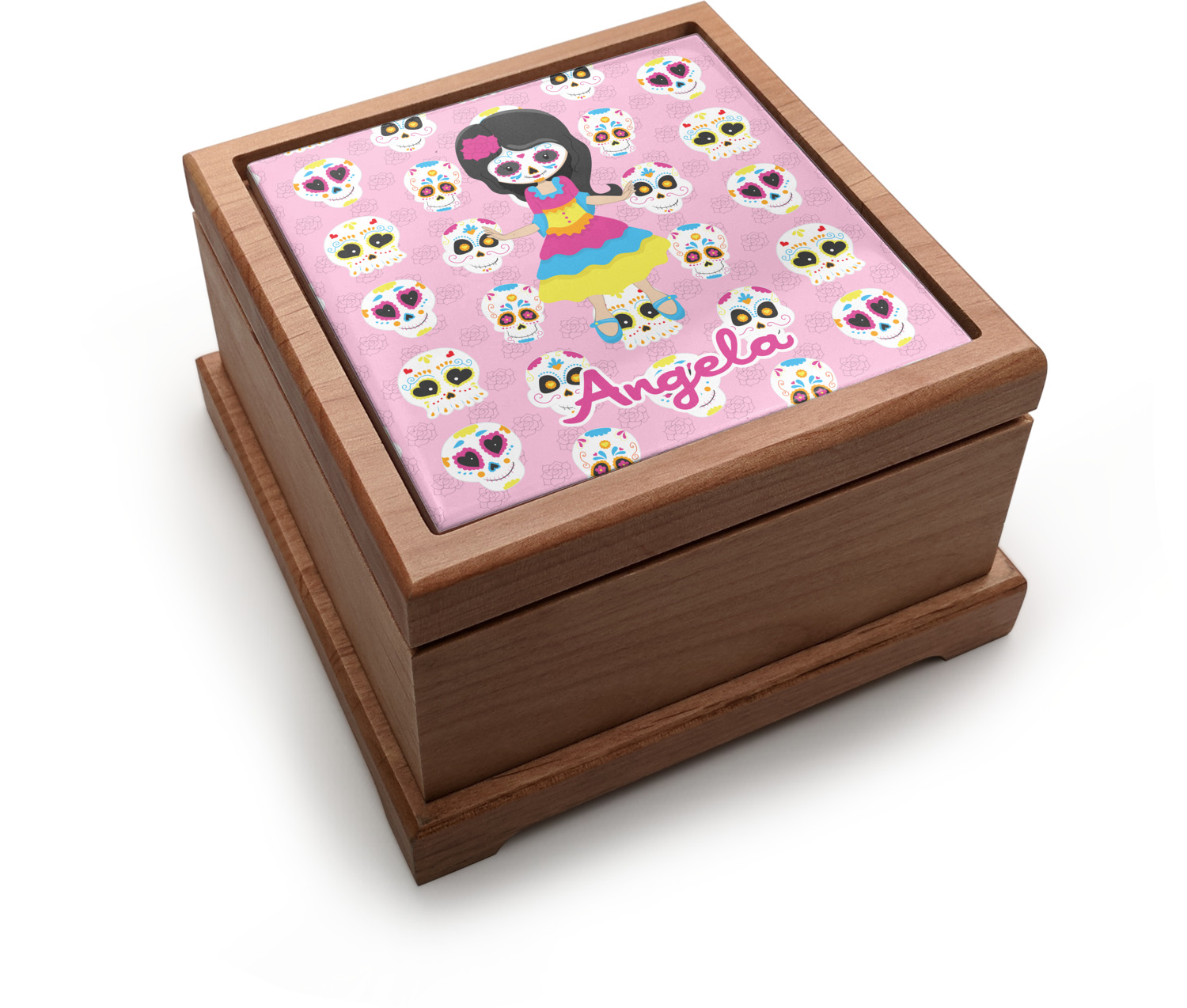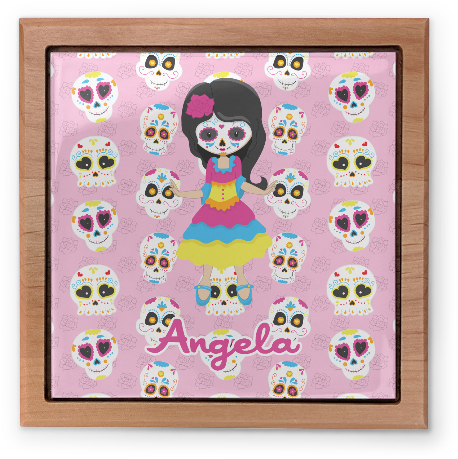 Most sugar skull design are only suitable for adults - not this one! This sugar skulls designs was done especially for kids who love sugar skulls. This is another one of our many layered designs where the background is a coordinating floral pattern; with kid friendly sugar skulls on top. We then topped it off with our girl who has her face painted. For personalization, we added her name to the bottom.