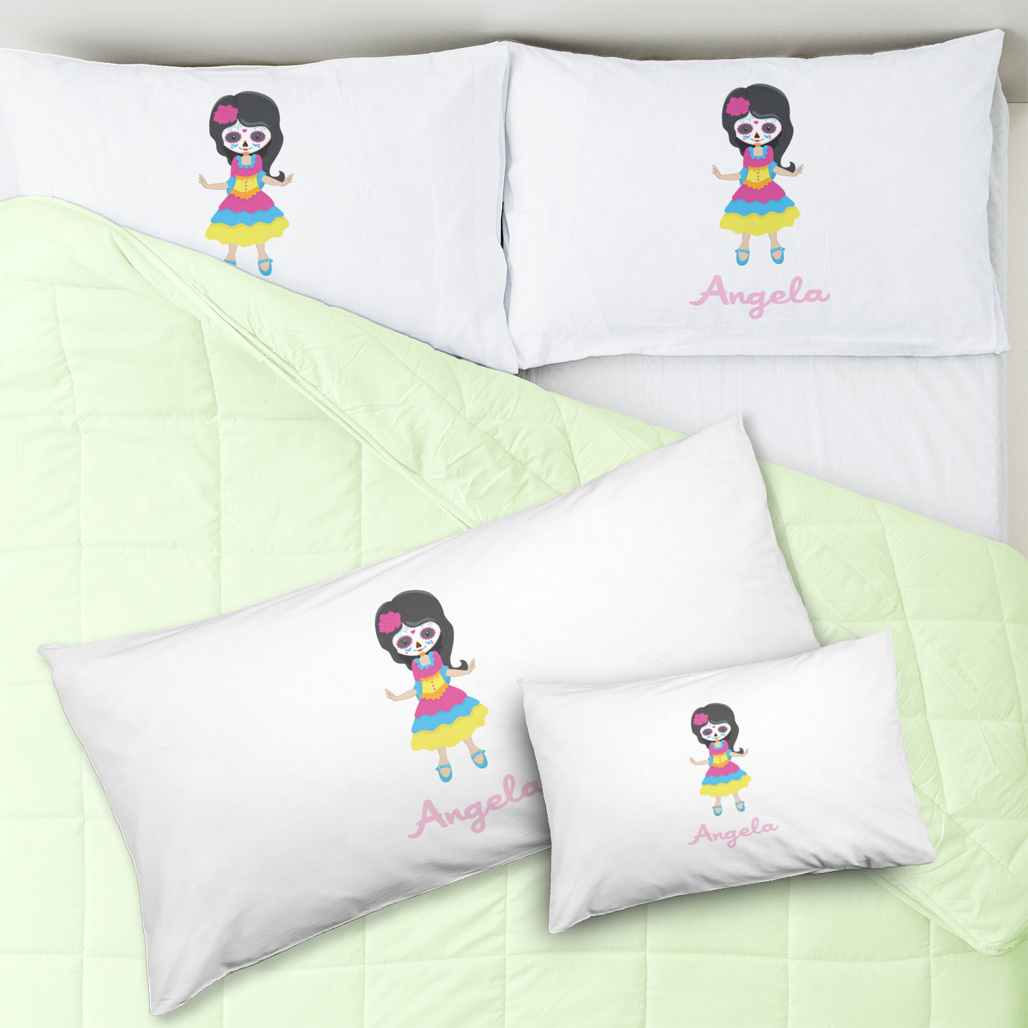 Most sugar skull design are only suitable for adults - not this one! This sugar skulls designs was done especially for kids who love sugar skulls. This is another one of our many layered designs where the background is a coordinating floral pattern; with kid friendly sugar skulls on top. We then topped it off with our girl who has her face painted. For personalization, we added her name to the bottom.