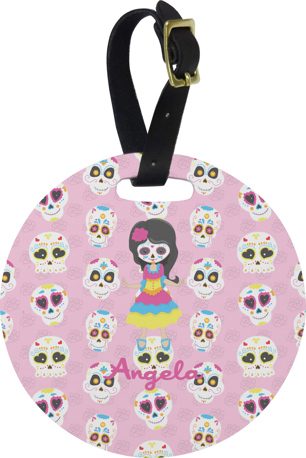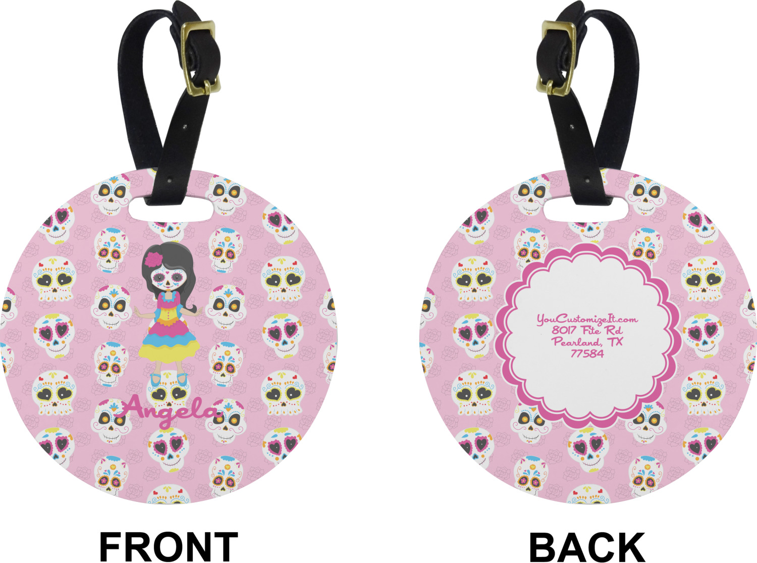 These personalized bag tags are sold in a variety of shapes, so that you may find the product that meets your vision exactly. We sell a round luggage tag, which measures at approximately 4" x 4". Our square luggage tag is about 3.5" x 3.5", while our rectangular version is 2.75" x 4 ".