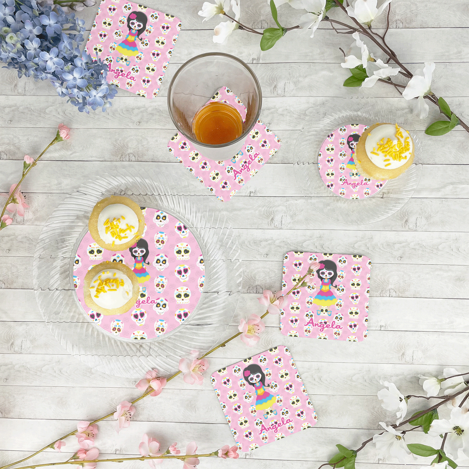 Most sugar skull design are only suitable for adults - not this one! This sugar skulls designs was done especially for kids who love sugar skulls. This is another one of our many layered designs where the background is a coordinating floral pattern; with kid friendly sugar skulls on top. We then topped it off with our girl who has her face painted. For personalization, we added her name to the bottom.