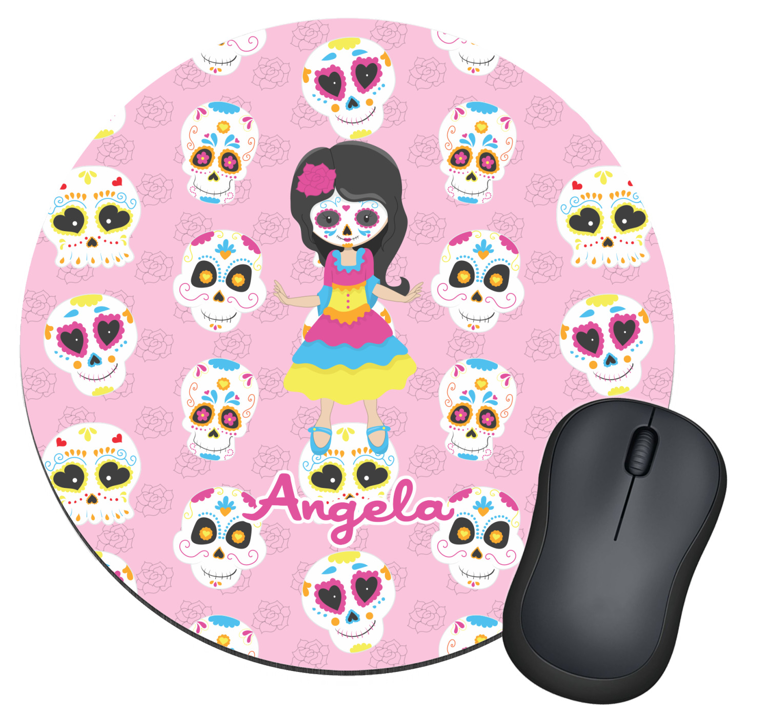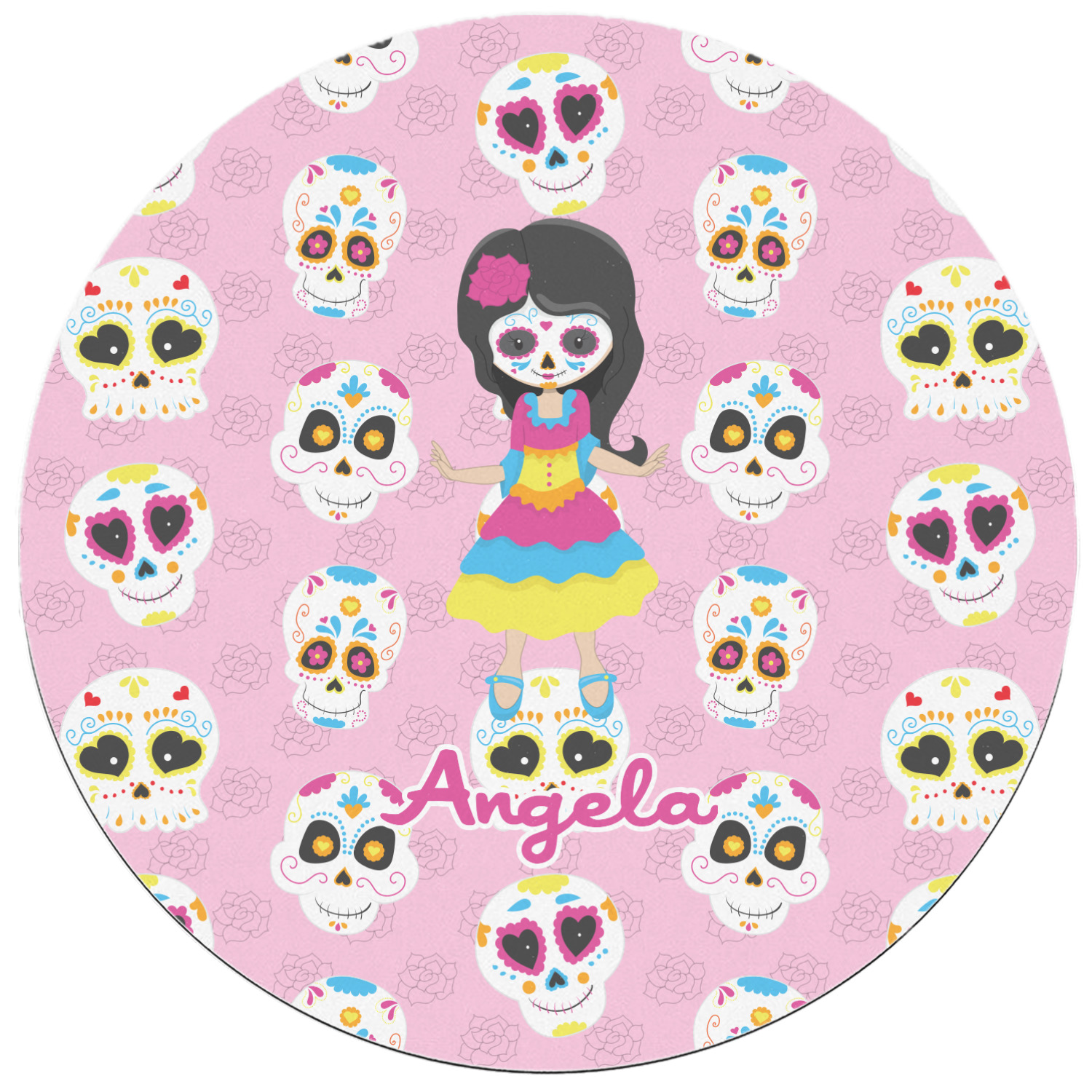 Most sugar skull design are only suitable for adults - not this one! This sugar skulls designs was done especially for kids who love sugar skulls. This is another one of our many layered designs where the background is a coordinating floral pattern; with kid friendly sugar skulls on top. We then topped it off with our girl who has her face painted. For personalization, we added her name to the bottom.