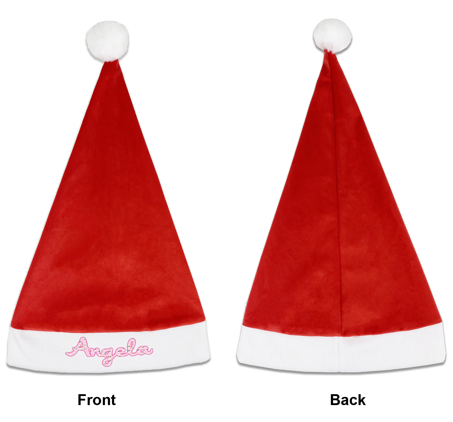Our Santa hats are a soft, velvety polyester material. These customizable Santa hats are a classic red with white brimming and pom pom ball hanging off the hat tail just like Santa Claus! Each personalized Santa hat is approximately 17.5 L x 11.8 W. We offer two different styles to print your designs on the white brim - front or front & back.