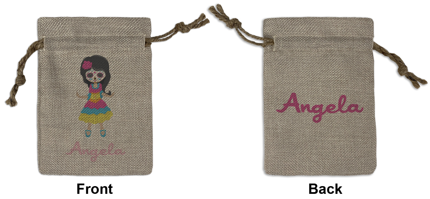 We sell our Burlap Gift Bags in 3 variant sized bags. Made with burlap polyester, each personalized bag can be secured with a twine drawstring pull. Your custom design is available to print on one side or both sides - completely up to you! The sizes of the bags measure approximately 4.5" x 6.5" for the smallest size, 6.5" x 8.0" for the medium size, and 6.5" x 13.5" for the large-sized bag.