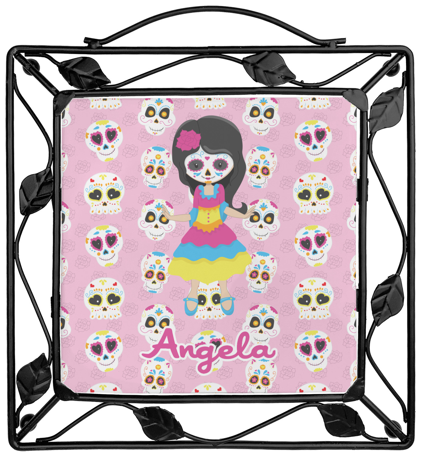 Our square trivets are made from a durable, wrought iron. This model features 4 small half circles, one on each corner, and a larger ring of iron that circles the central, customized tile. Each of the 4 corners has a round foot on its bottom for stability. This trivet is 8.75 by 8.75 inches, but the central tile measures at 6 inches on both sides.