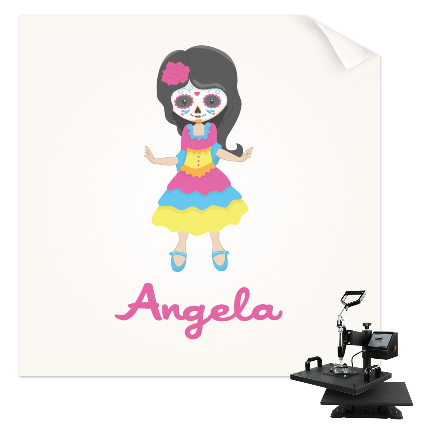Most sugar skull design are only suitable for adults - not this one! This sugar skulls designs was done especially for kids who love sugar skulls. This is another one of our many layered designs where the background is a coordinating floral pattern; with kid friendly sugar skulls on top. We then topped it off with our girl who has her face painted. For personalization, we added her name to the bottom.