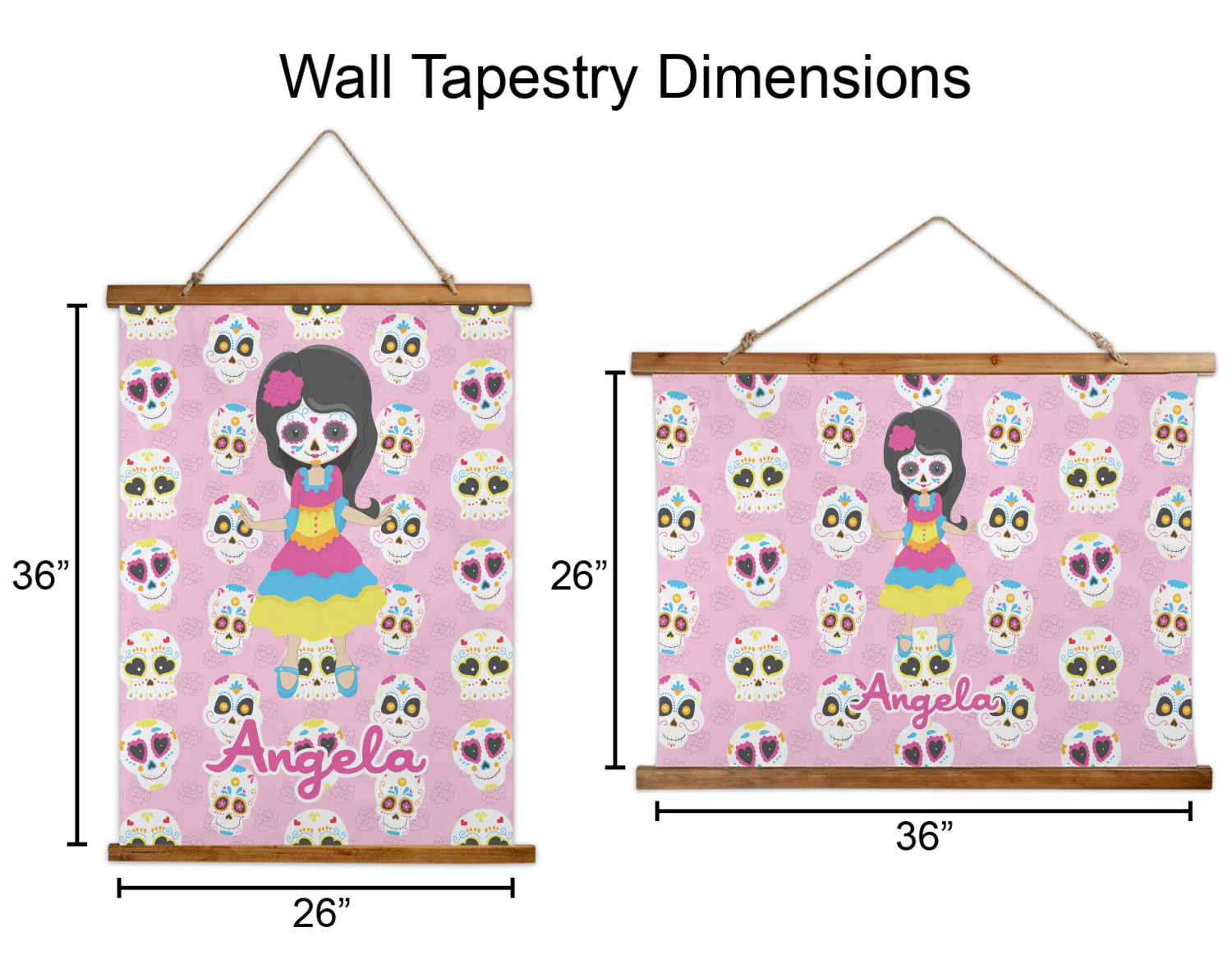 Made in two different orientations - portrait or landscape - both are 26" x 36". Your design is printed on a high quality polyester fabric with hemmed edges. The wood on the top and bottom of the tapestry is 1.25" tall and 0.25" thick and there are two pieces on top and bottom which sandwich the fabric.