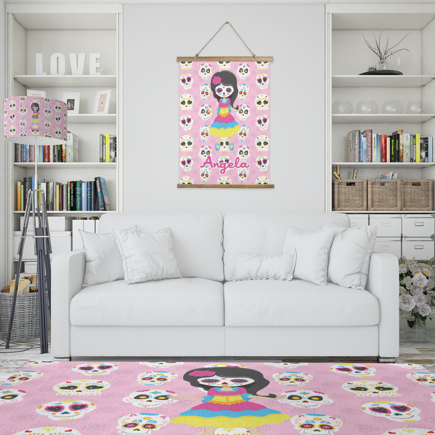 Most sugar skull design are only suitable for adults - not this one! This sugar skulls designs was done especially for kids who love sugar skulls. This is another one of our many layered designs where the background is a coordinating floral pattern; with kid friendly sugar skulls on top. We then topped it off with our girl who has her face painted. For personalization, we added her name to the bottom.