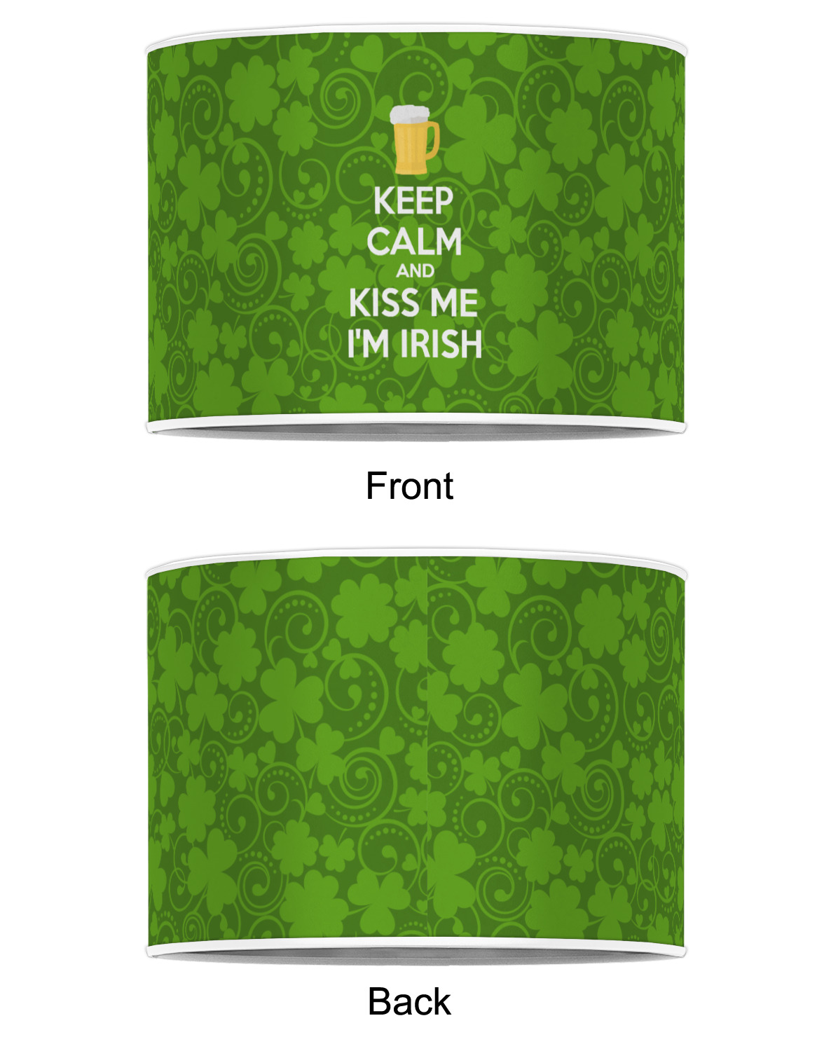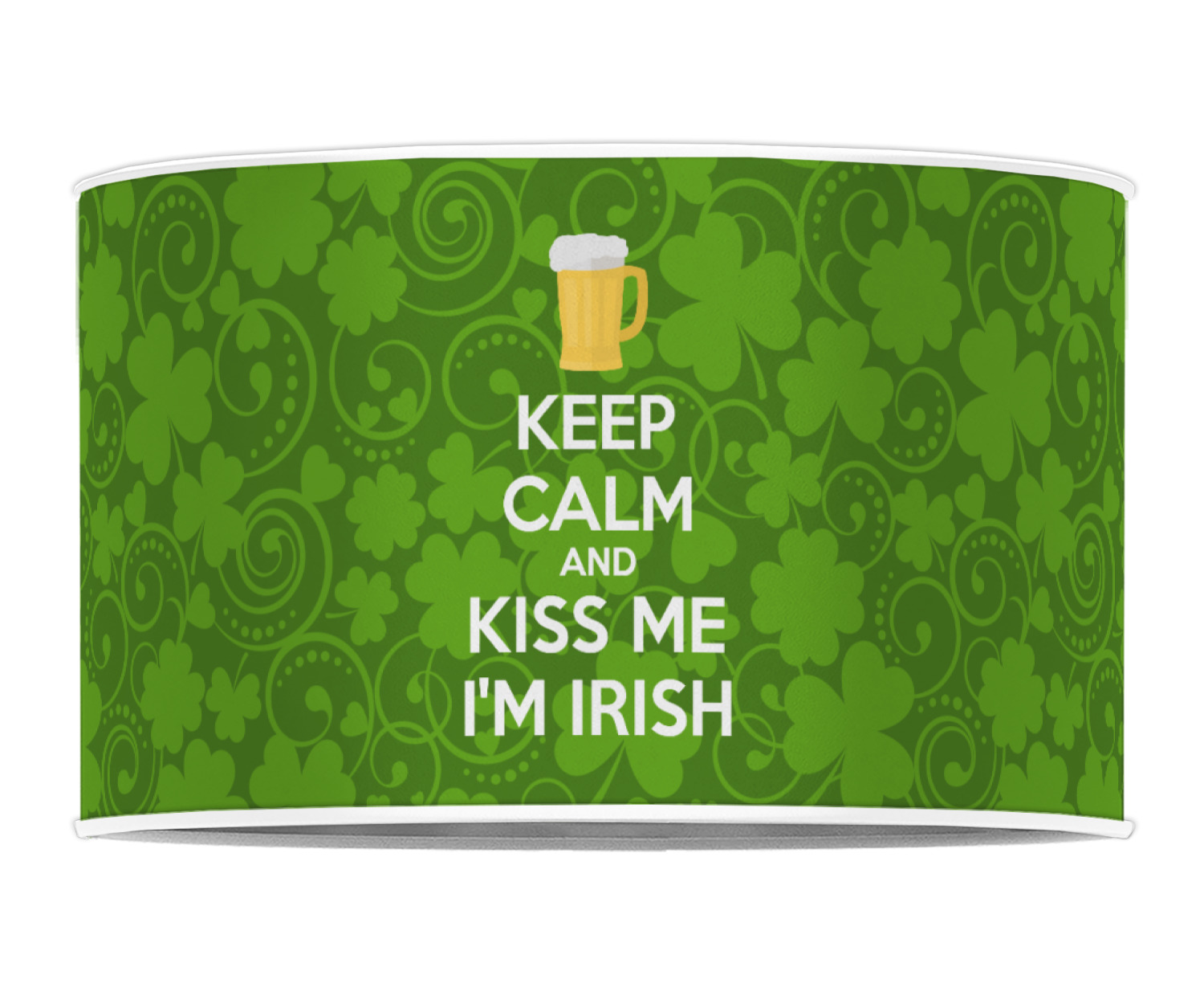 This lucky design is mostly bright green. The background has a lighter green and a darker green making up a background of clovers and swirls. The foreground is a fun phrase that says "Keep calm and kiss me I'm Irish." A fun beer graphic sits above this. You can easily personalize this phrase as well as the graphic above to be whatever you like.