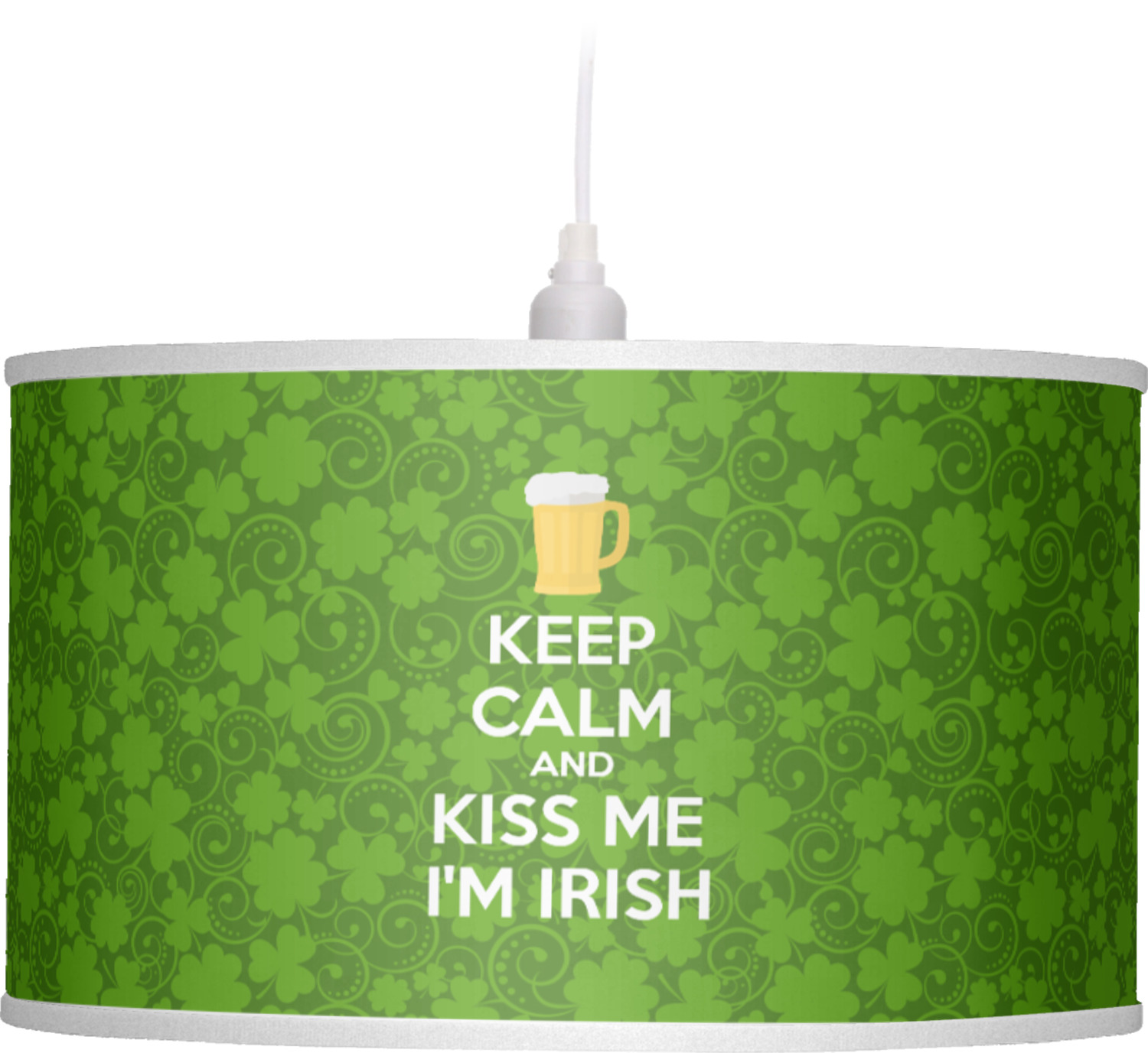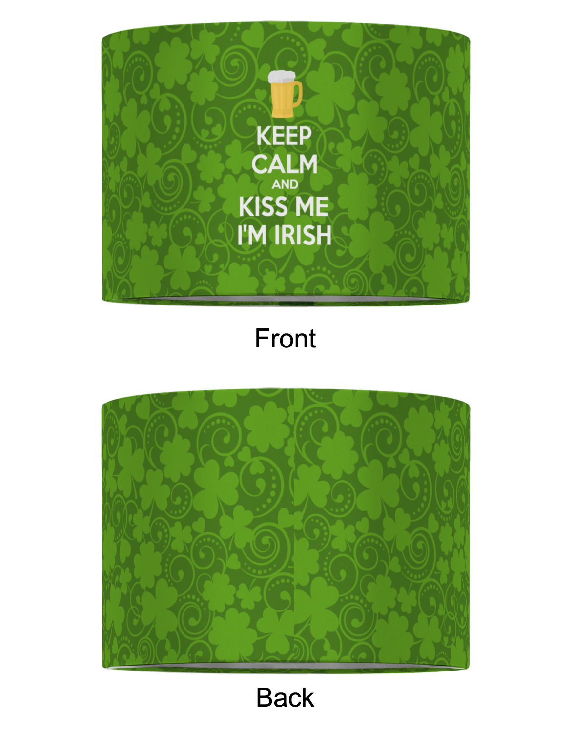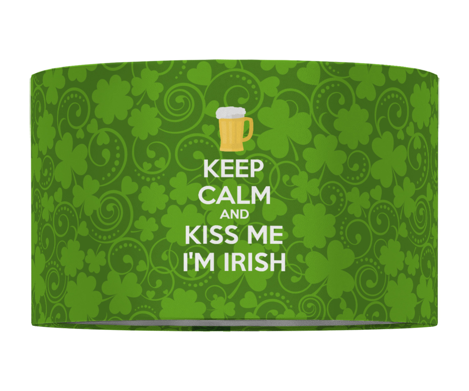 This lucky design is mostly bright green. The background has a lighter green and a darker green making up a background of clovers and swirls. The foreground is a fun phrase that says "Keep calm and kiss me I'm Irish." A fun beer graphic sits above this. You can easily personalize this phrase as well as the graphic above to be whatever you like.