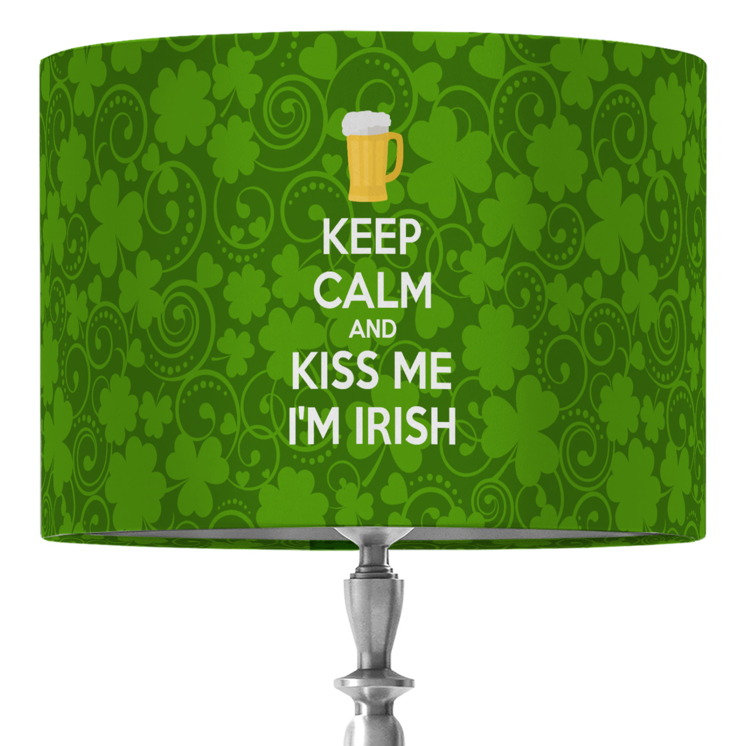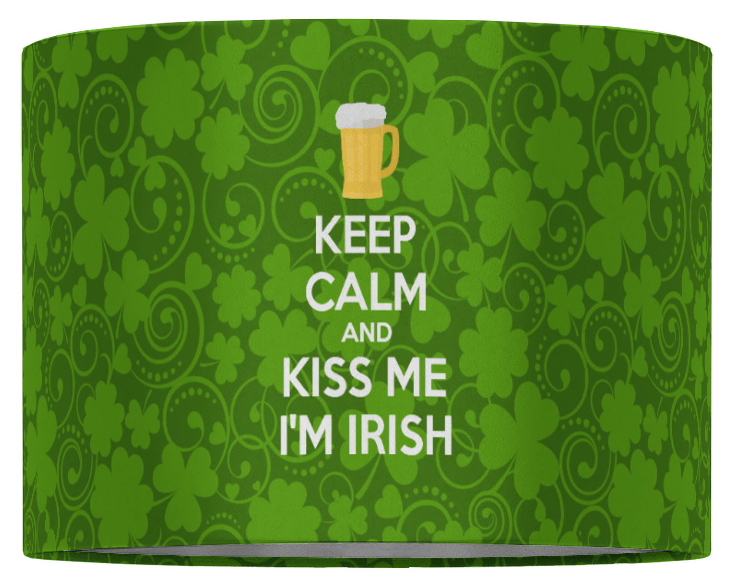 This lucky design is mostly bright green. The background has a lighter green and a darker green making up a background of clovers and swirls. The foreground is a fun phrase that says "Keep calm and kiss me I'm Irish." A fun beer graphic sits above this. You can easily personalize this phrase as well as the graphic above to be whatever you like.