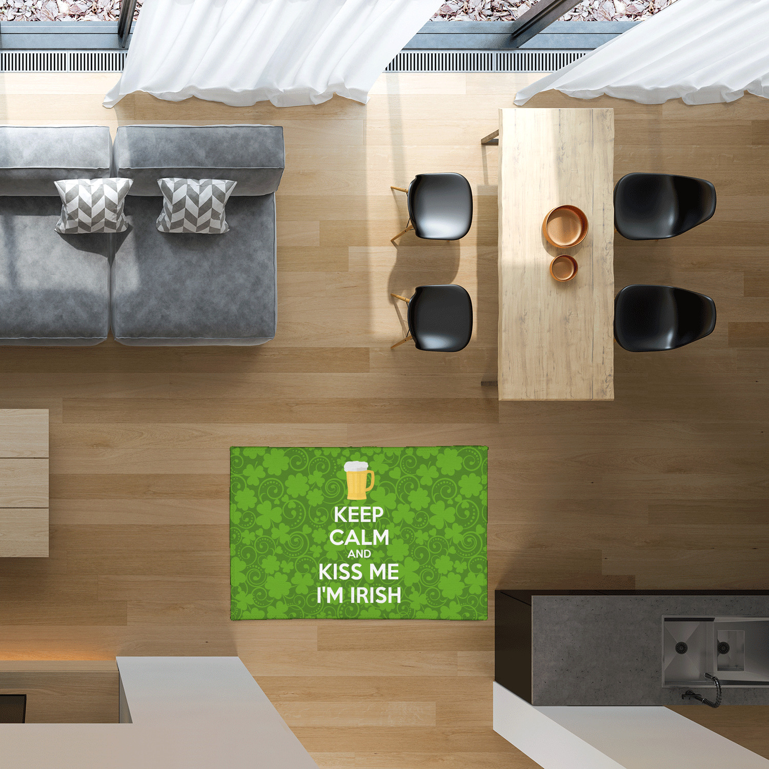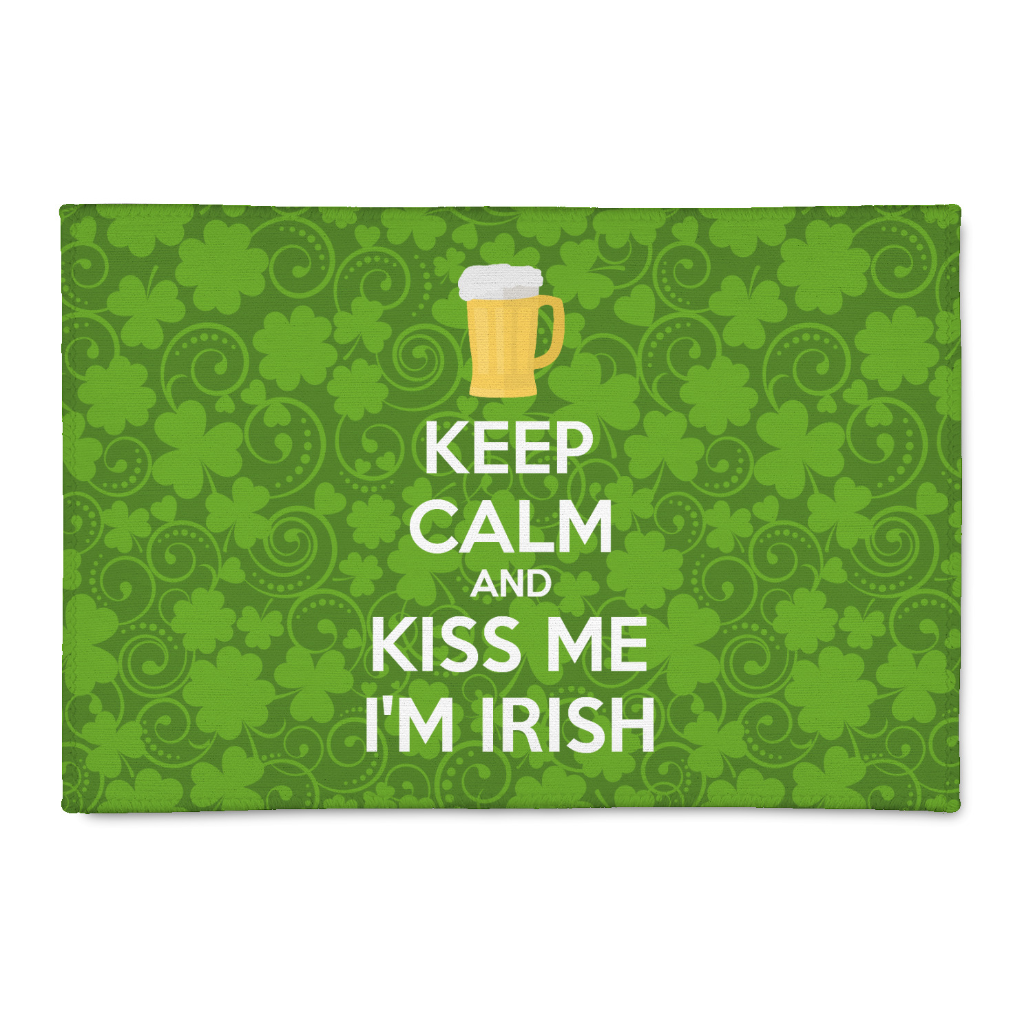 This lucky design is mostly bright green. The background has a lighter green and a darker green making up a background of clovers and swirls. The foreground is a fun phrase that says "Keep calm and kiss me I'm Irish." A fun beer graphic sits above this. You can easily personalize this phrase as well as the graphic above to be whatever you like.