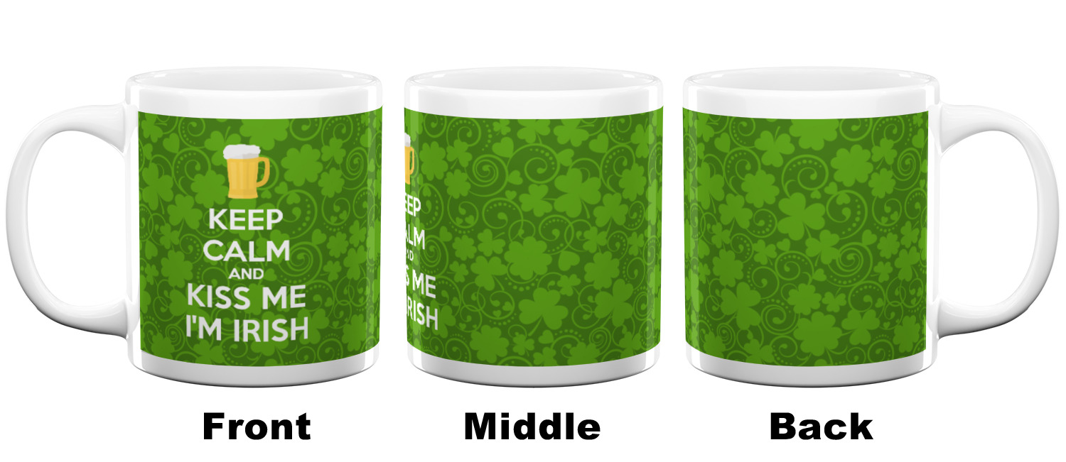 This lucky design is mostly bright green. The background has a lighter green and a darker green making up a background of clovers and swirls. The foreground is a fun phrase that says "Keep calm and kiss me I'm Irish." A fun beer graphic sits above this. You can easily personalize this phrase as well as the graphic above to be whatever you like.