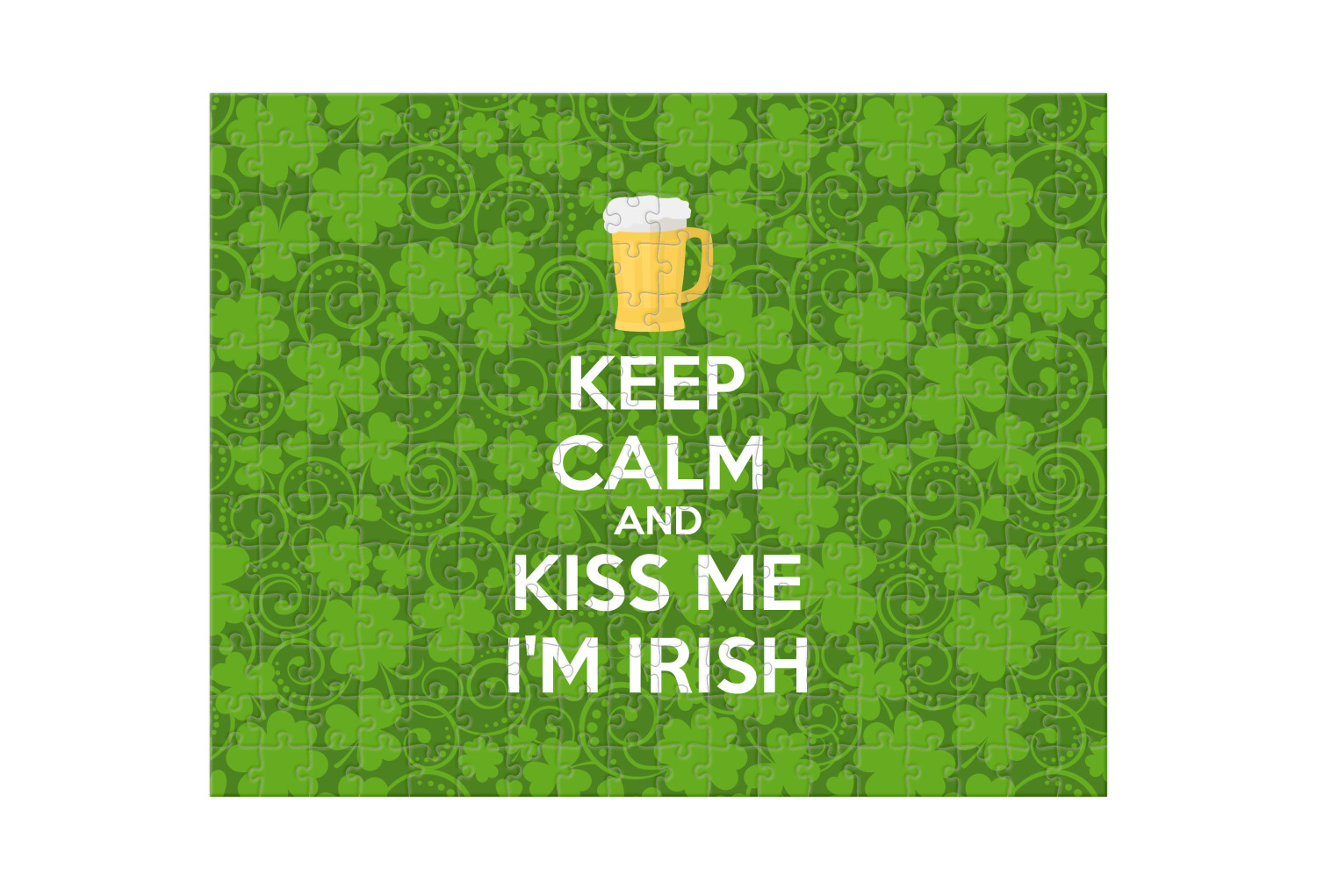 This lucky design is mostly bright green. The background has a lighter green and a darker green making up a background of clovers and swirls. The foreground is a fun phrase that says "Keep calm and kiss me I'm Irish." A fun beer graphic sits above this. You can easily personalize this phrase as well as the graphic above to be whatever you like.
