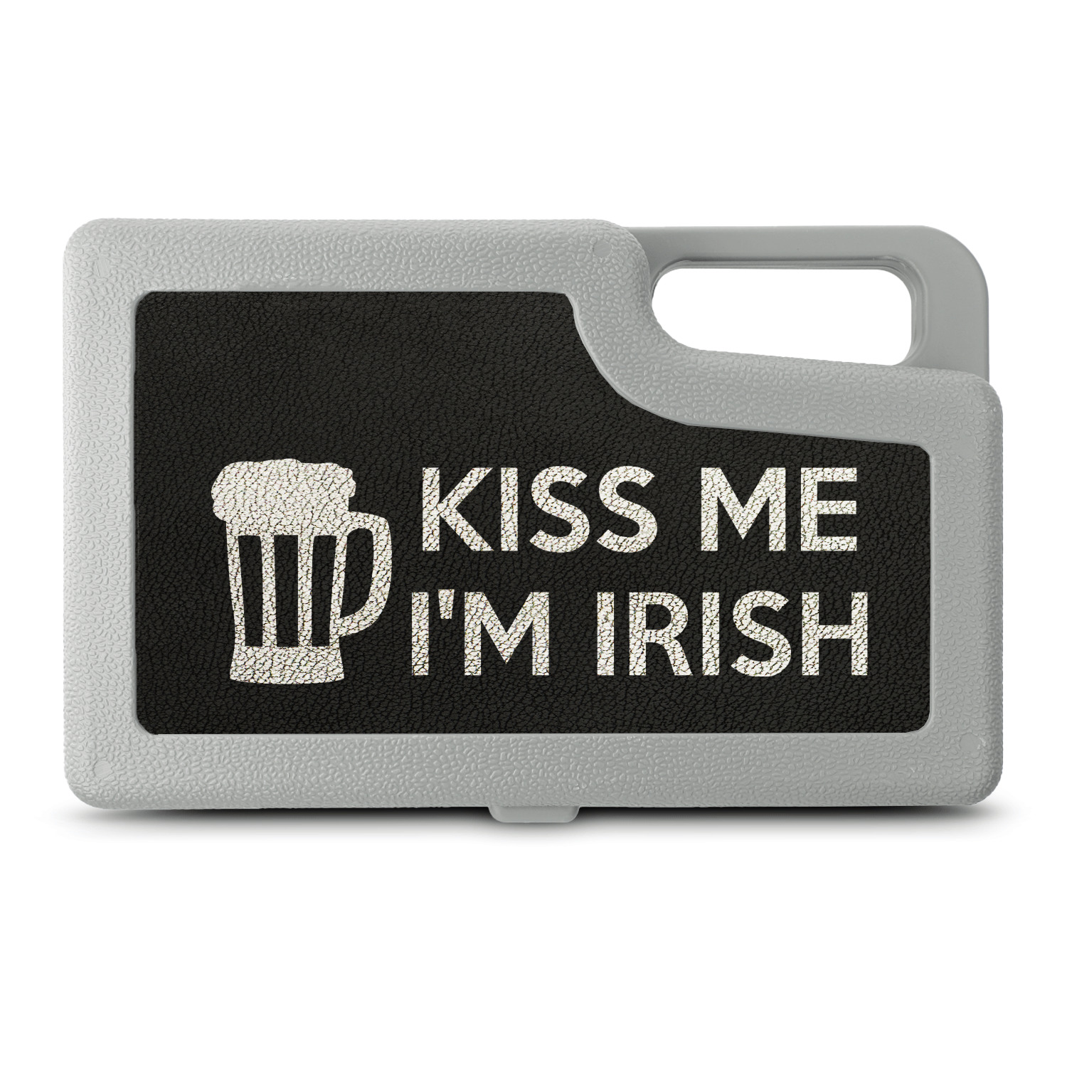 This lucky design is mostly bright green. The background has a lighter green and a darker green making up a background of clovers and swirls. The foreground is a fun phrase that says "Keep calm and kiss me I'm Irish." A fun beer graphic sits above this. You can easily personalize this phrase as well as the graphic above to be whatever you like.