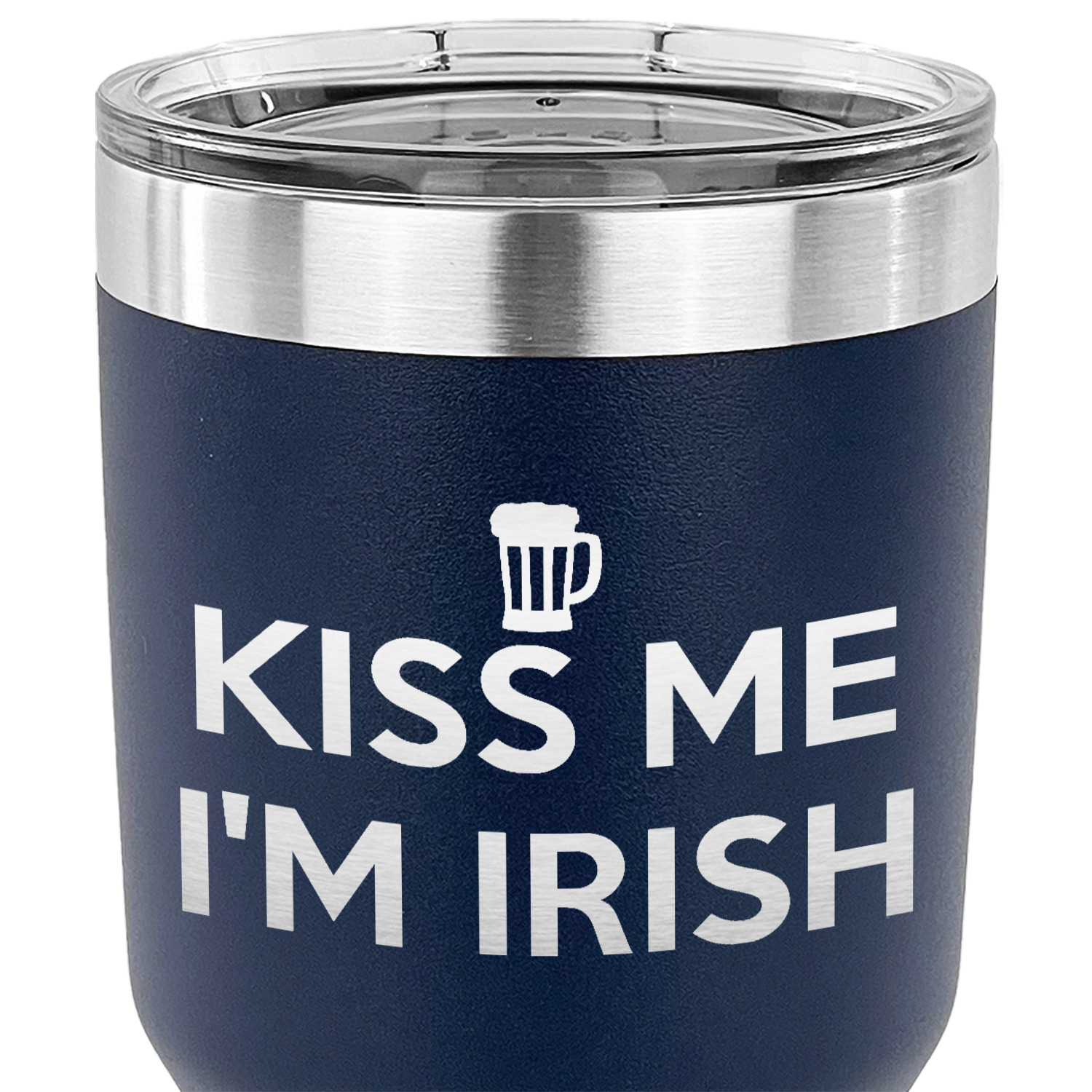 This lucky design is mostly bright green. The background has a lighter green and a darker green making up a background of clovers and swirls. The foreground is a fun phrase that says "Keep calm and kiss me I'm Irish." A fun beer graphic sits above this. You can easily personalize this phrase as well as the graphic above to be whatever you like.