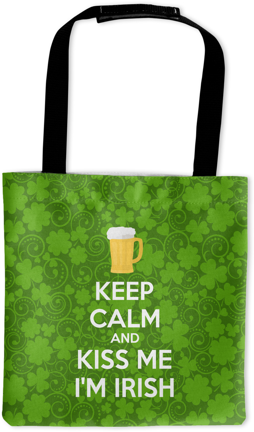 This lucky design is mostly bright green. The background has a lighter green and a darker green making up a background of clovers and swirls. The foreground is a fun phrase that says "Keep calm and kiss me I'm Irish." A fun beer graphic sits above this. You can easily personalize this phrase as well as the graphic above to be whatever you like.