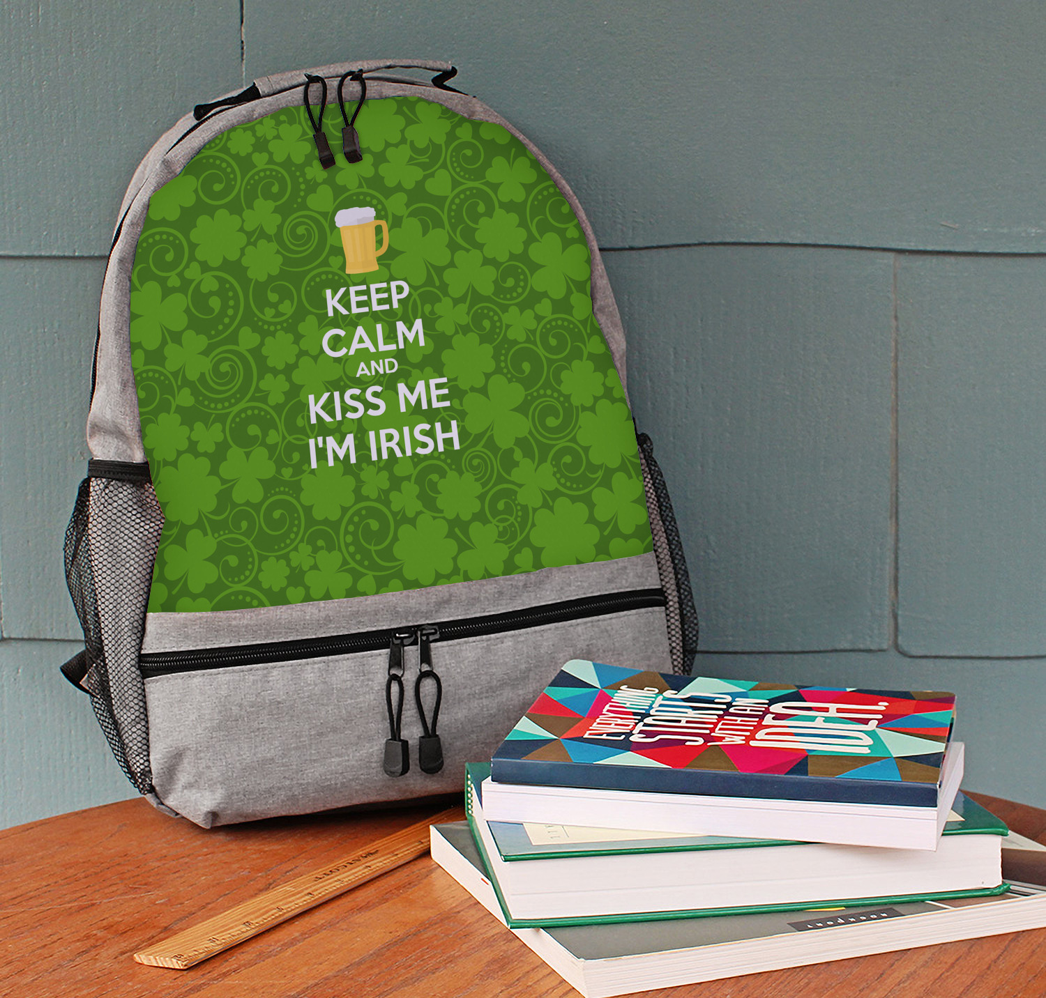 This lucky design is mostly bright green. The background has a lighter green and a darker green making up a background of clovers and swirls. The foreground is a fun phrase that says "Keep calm and kiss me I'm Irish." A fun beer graphic sits above this. You can easily personalize this phrase as well as the graphic above to be whatever you like.
