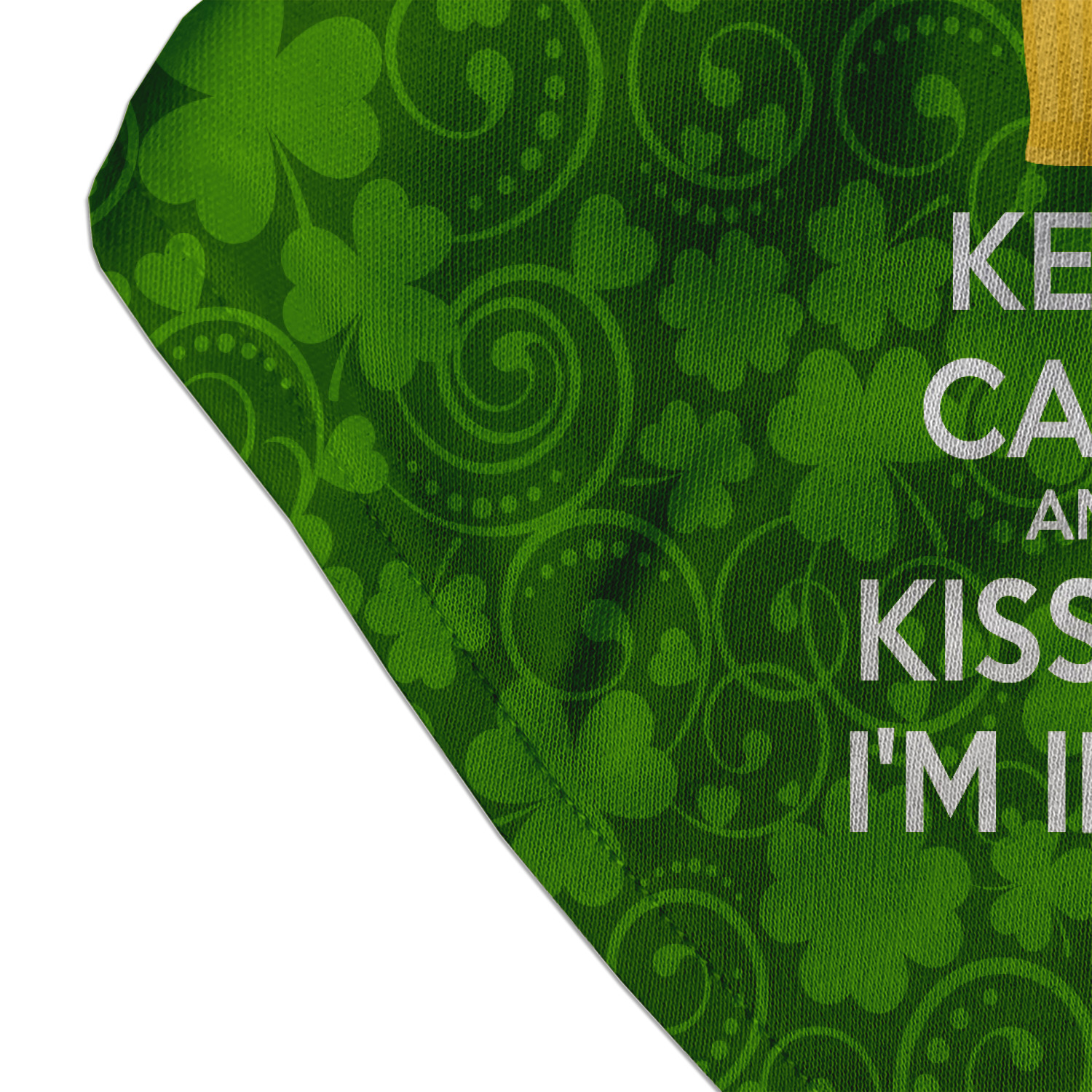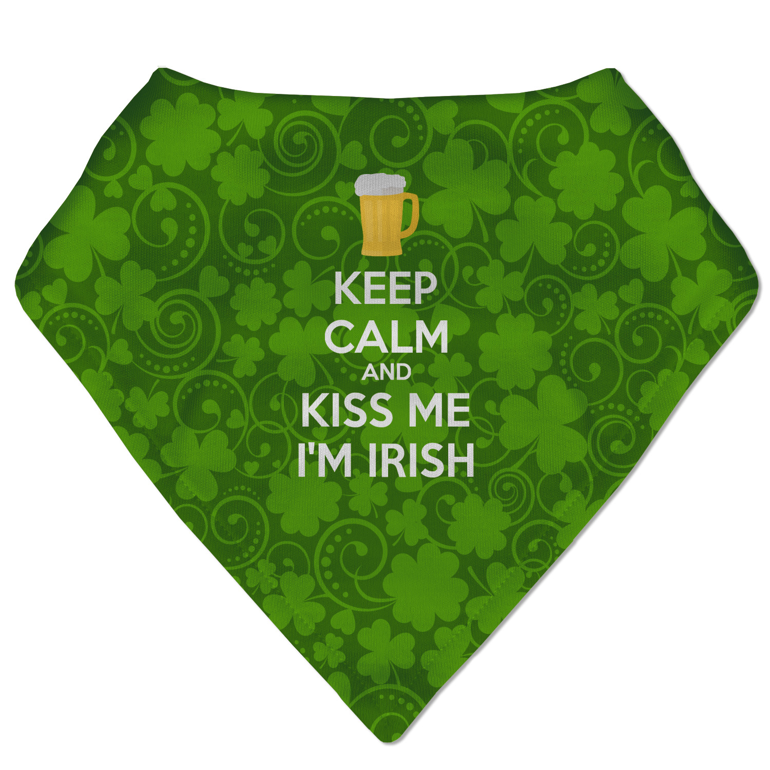 This lucky design is mostly bright green. The background has a lighter green and a darker green making up a background of clovers and swirls. The foreground is a fun phrase that says "Keep calm and kiss me I'm Irish." A fun beer graphic sits above this. You can easily personalize this phrase as well as the graphic above to be whatever you like.