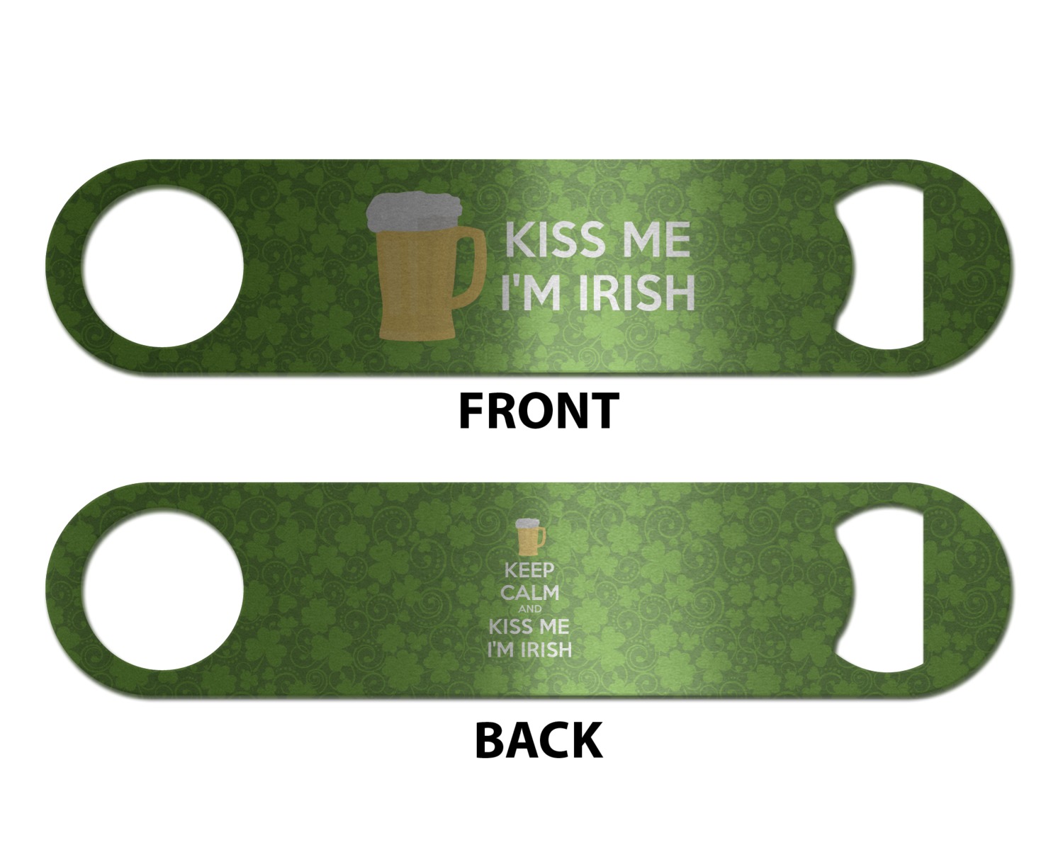 This lucky design is mostly bright green. The background has a lighter green and a darker green making up a background of clovers and swirls. The foreground is a fun phrase that says "Keep calm and kiss me I'm Irish." A fun beer graphic sits above this. You can easily personalize this phrase as well as the graphic above to be whatever you like.