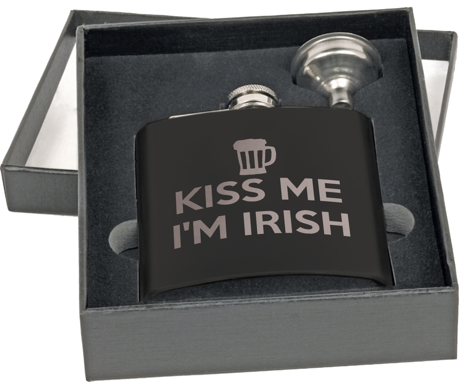 Built from a stainless steel and then covered with a black coating, this hip flask, has a very classy appearance. Similar to the standard flask, this stainless steel flask has the traditional curved shape for a snug fit in your palm. This flask set also includes a traditional screw and flip lid and liquid funnel in a gift box. At 4 by 4.5 inches, this flask can hold up to 6 ounces. Your personalized design is laser-engraved across the front of this flask.