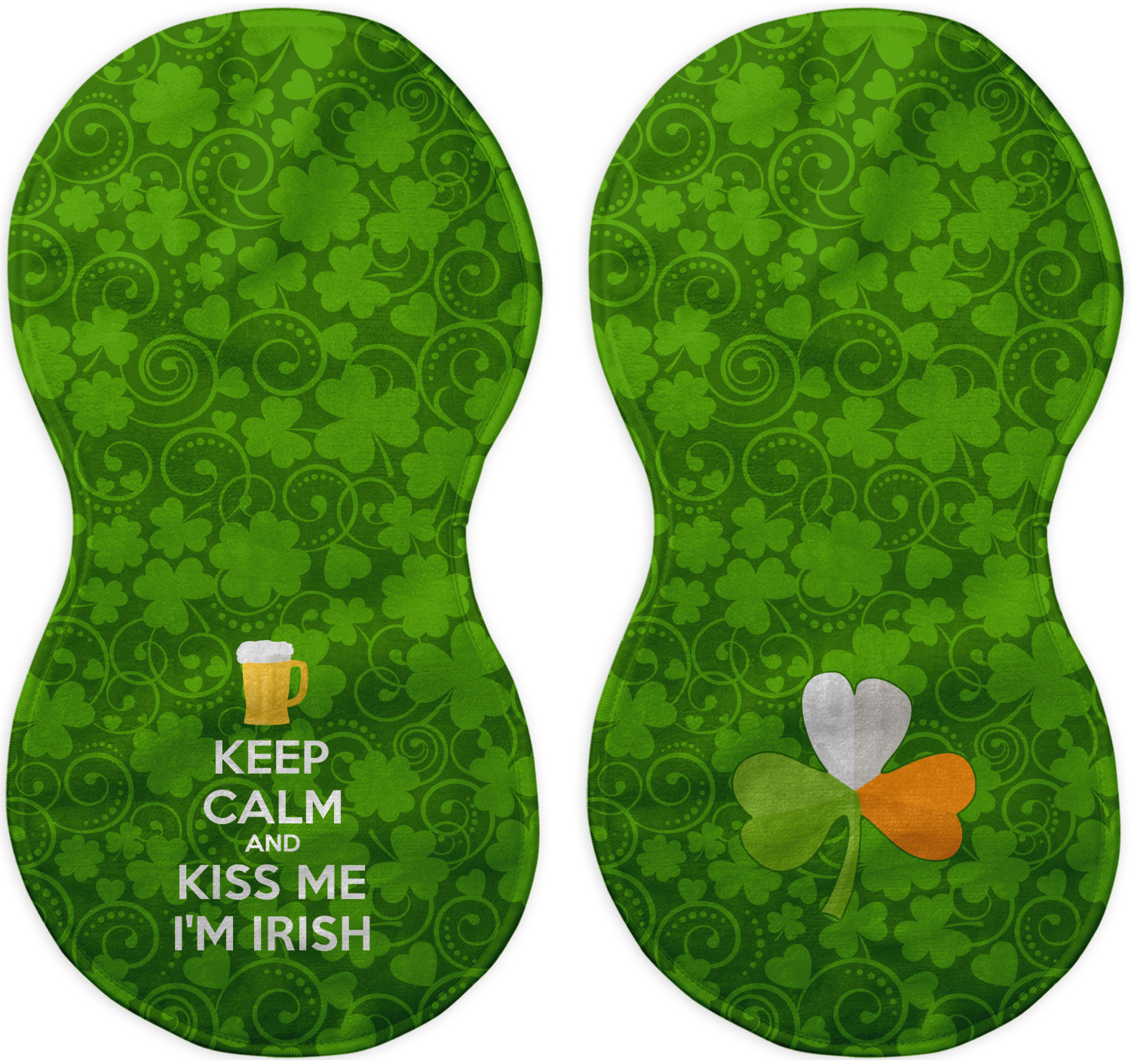 This lucky design is mostly bright green. The background has a lighter green and a darker green making up a background of clovers and swirls. The foreground is a fun phrase that says "Keep calm and kiss me I'm Irish." A fun beer graphic sits above this. You can easily personalize this phrase as well as the graphic above to be whatever you like.