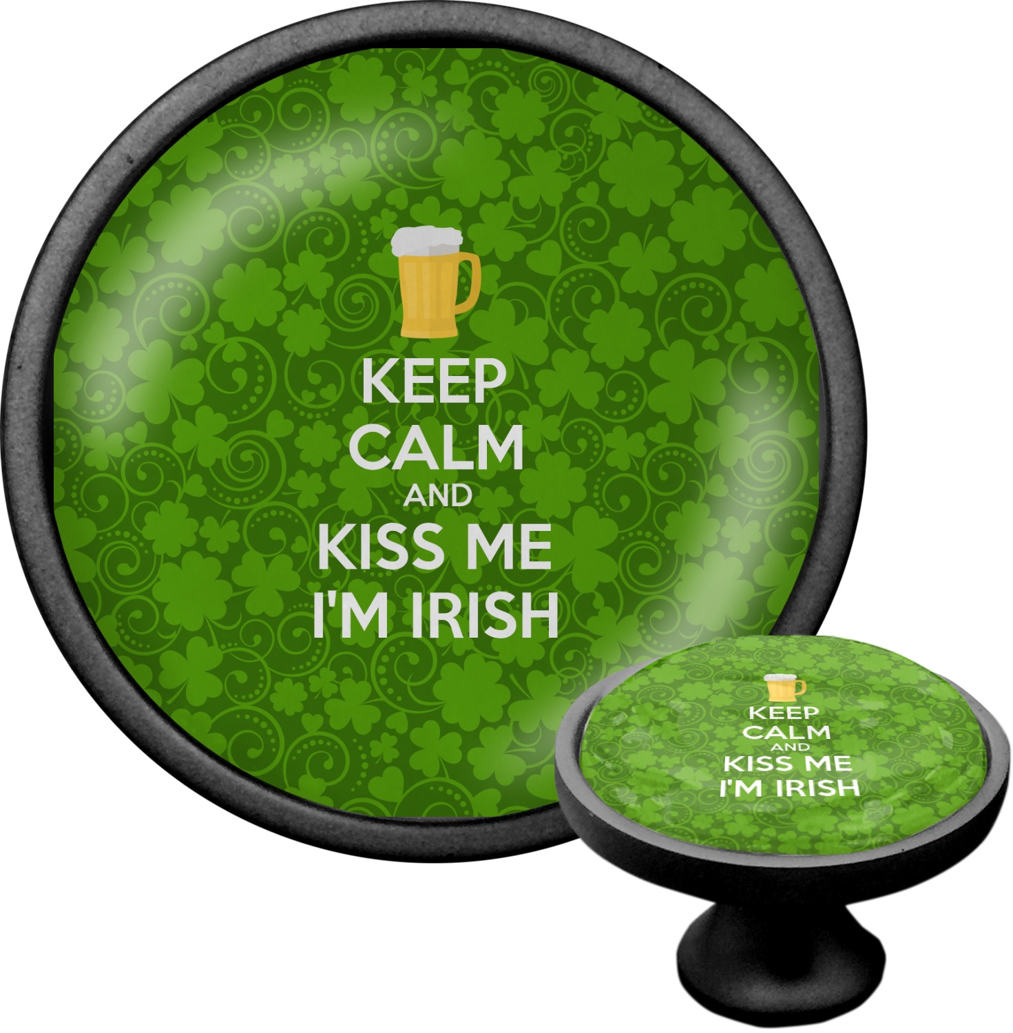 This lucky design is mostly bright green. The background has a lighter green and a darker green making up a background of clovers and swirls. The foreground is a fun phrase that says "Keep calm and kiss me I'm Irish." A fun beer graphic sits above this. You can easily personalize this phrase as well as the graphic above to be whatever you like.