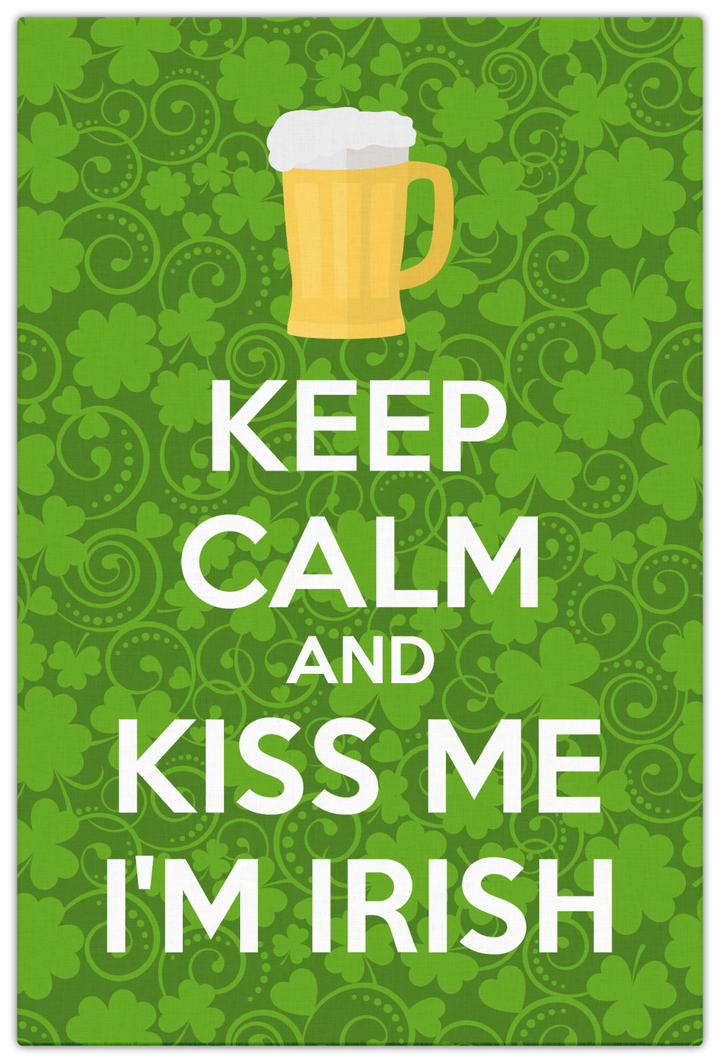 This lucky design is mostly bright green. The background has a lighter green and a darker green making up a background of clovers and swirls. The foreground is a fun phrase that says "Keep calm and kiss me I'm Irish." A fun beer graphic sits above this. You can easily personalize this phrase as well as the graphic above to be whatever you like.
