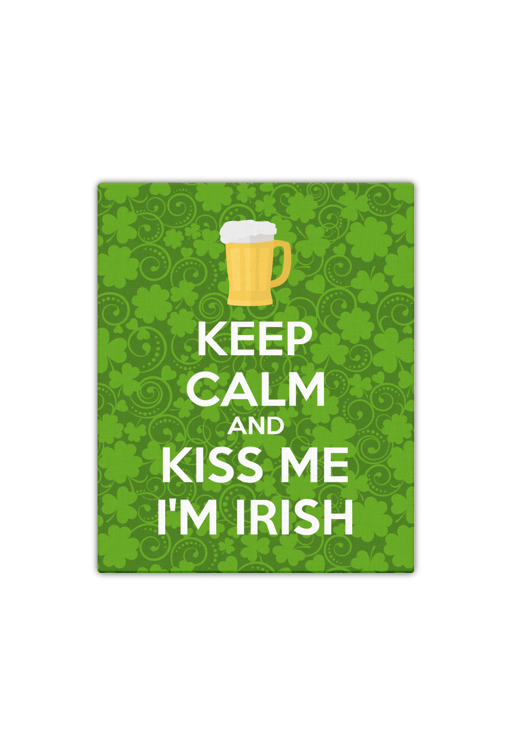 This lucky design is mostly bright green. The background has a lighter green and a darker green making up a background of clovers and swirls. The foreground is a fun phrase that says "Keep calm and kiss me I'm Irish." A fun beer graphic sits above this. You can easily personalize this phrase as well as the graphic above to be whatever you like.