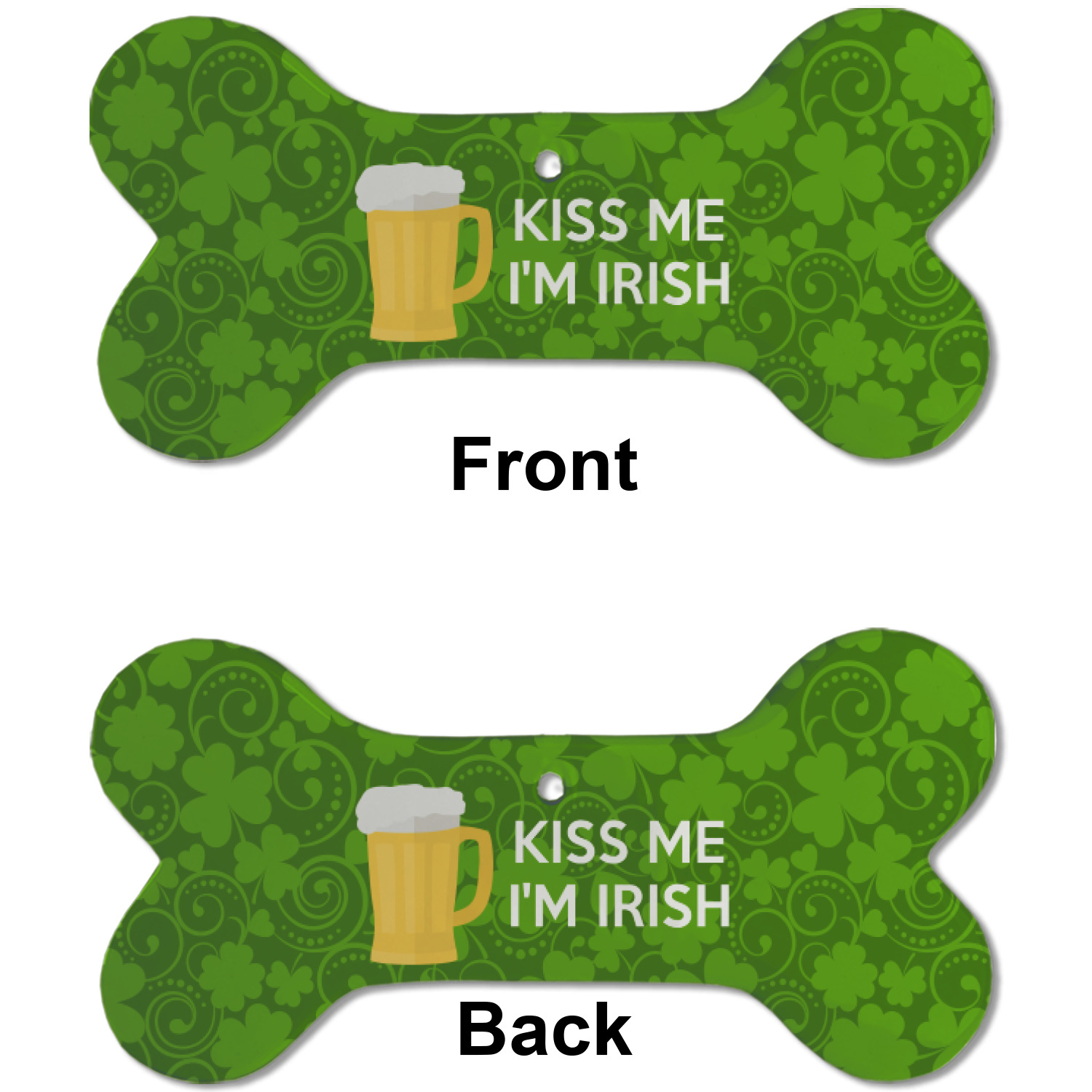 This lucky design is mostly bright green. The background has a lighter green and a darker green making up a background of clovers and swirls. The foreground is a fun phrase that says "Keep calm and kiss me I'm Irish." A fun beer graphic sits above this. You can easily personalize this phrase as well as the graphic above to be whatever you like.