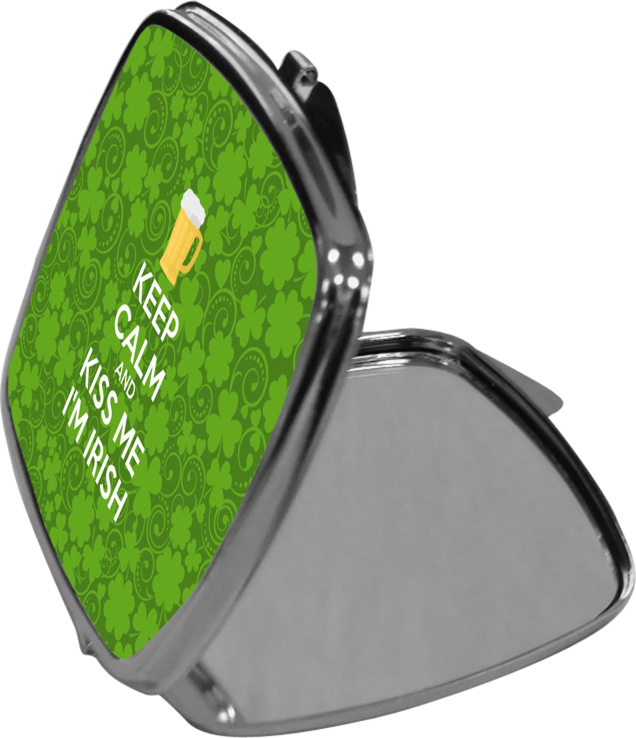 Our compact mirrors are customized with your design on one side. The other side is patterned silver tone metal. Inside, there are two mirrors.