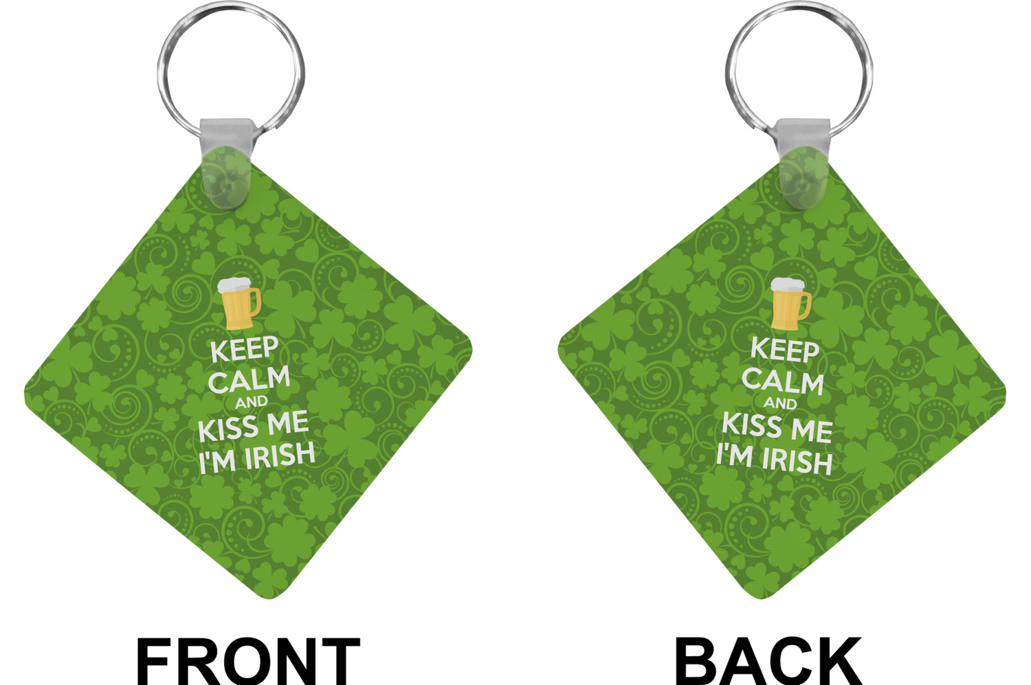 This lucky design is mostly bright green. The background has a lighter green and a darker green making up a background of clovers and swirls. The foreground is a fun phrase that says "Keep calm and kiss me I'm Irish." A fun beer graphic sits above this. You can easily personalize this phrase as well as the graphic above to be whatever you like.