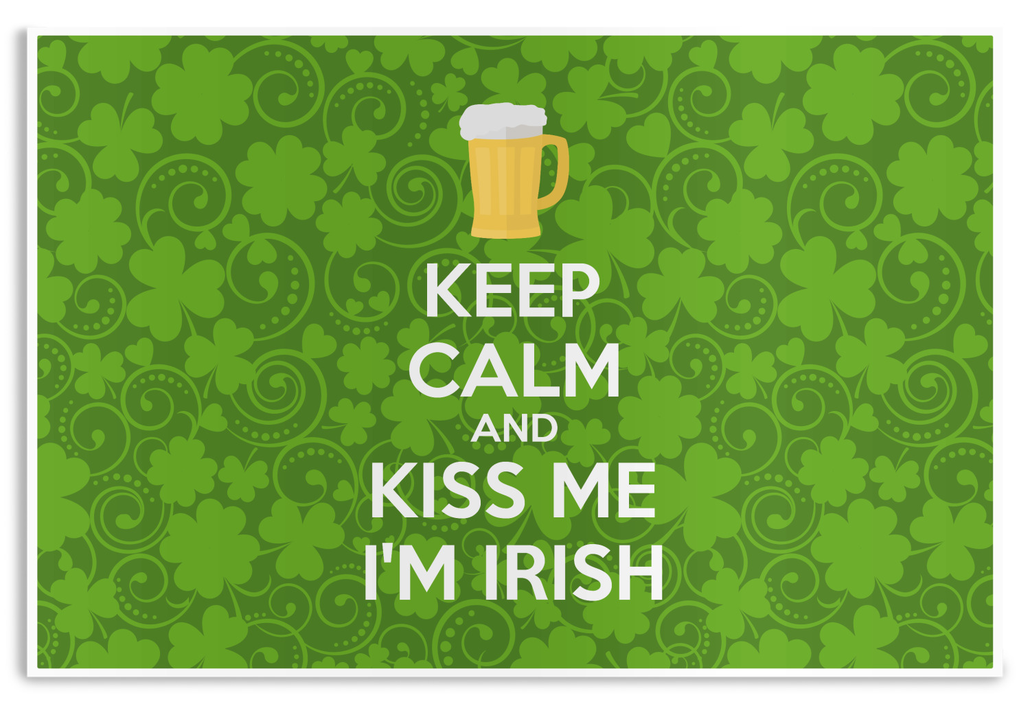 This lucky design is mostly bright green. The background has a lighter green and a darker green making up a background of clovers and swirls. The foreground is a fun phrase that says "Keep calm and kiss me I'm Irish." A fun beer graphic sits above this. You can easily personalize this phrase as well as the graphic above to be whatever you like.