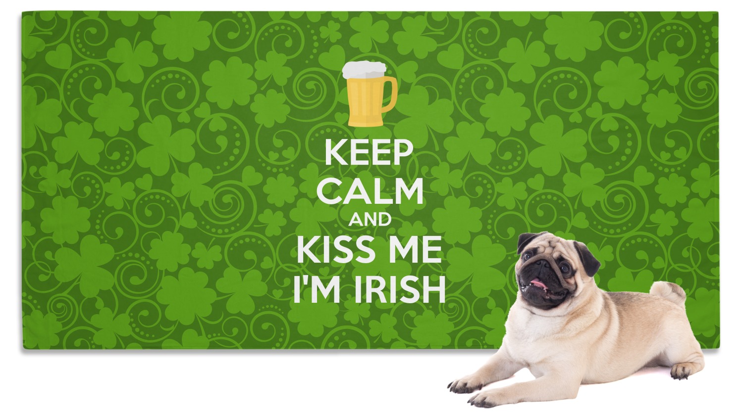 This lucky design is mostly bright green. The background has a lighter green and a darker green making up a background of clovers and swirls. The foreground is a fun phrase that says "Keep calm and kiss me I'm Irish." A fun beer graphic sits above this. You can easily personalize this phrase as well as the graphic above to be whatever you like.