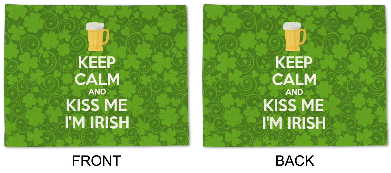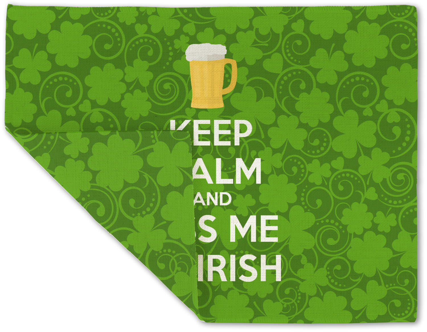 This lucky design is mostly bright green. The background has a lighter green and a darker green making up a background of clovers and swirls. The foreground is a fun phrase that says "Keep calm and kiss me I'm Irish." A fun beer graphic sits above this. You can easily personalize this phrase as well as the graphic above to be whatever you like.