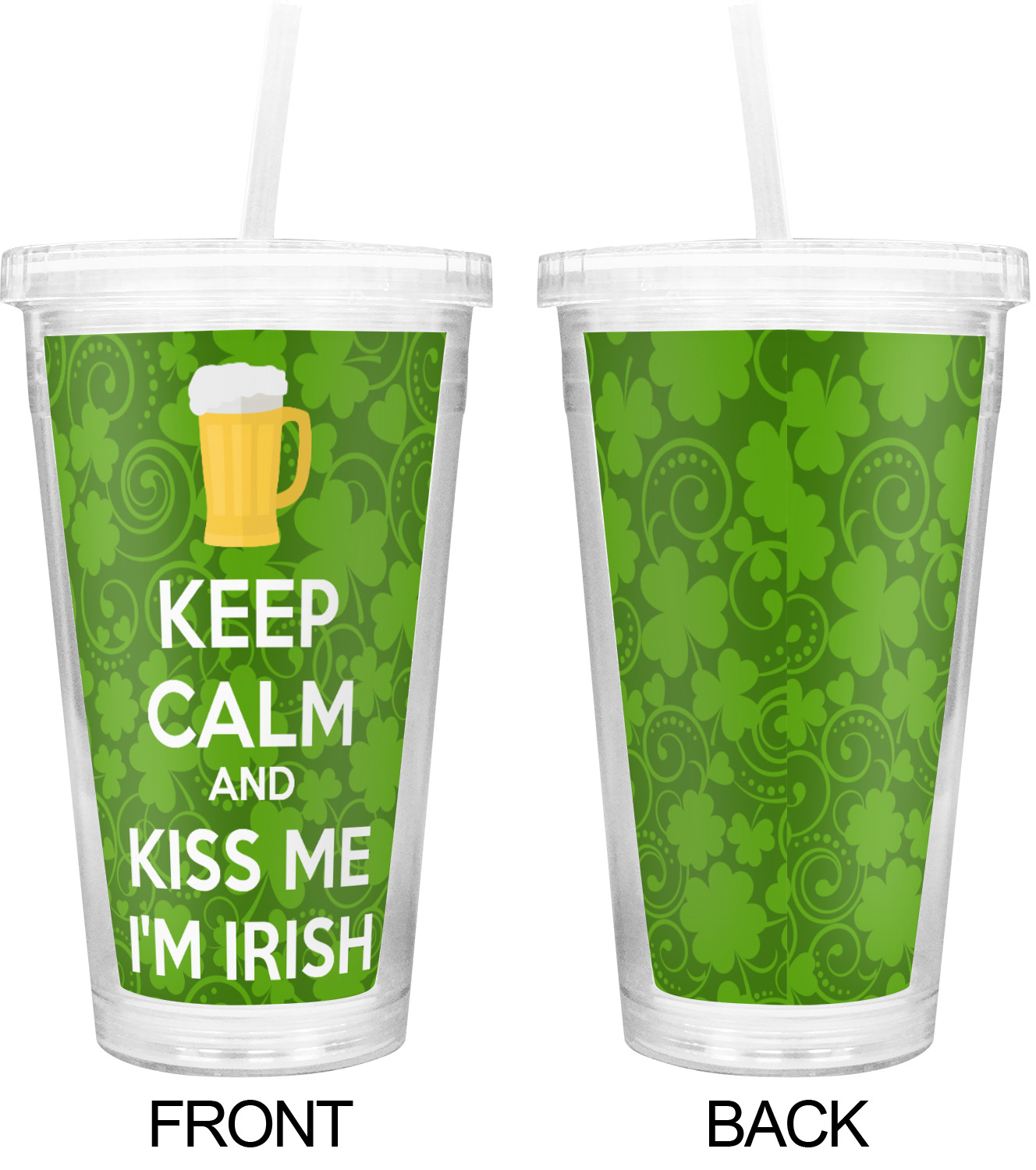 This lucky design is mostly bright green. The background has a lighter green and a darker green making up a background of clovers and swirls. The foreground is a fun phrase that says "Keep calm and kiss me I'm Irish." A fun beer graphic sits above this. You can easily personalize this phrase as well as the graphic above to be whatever you like.