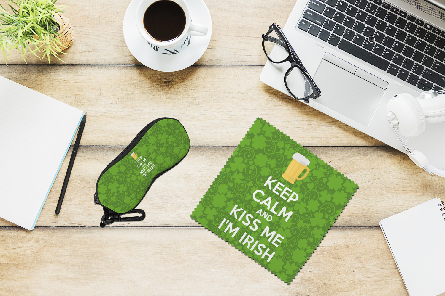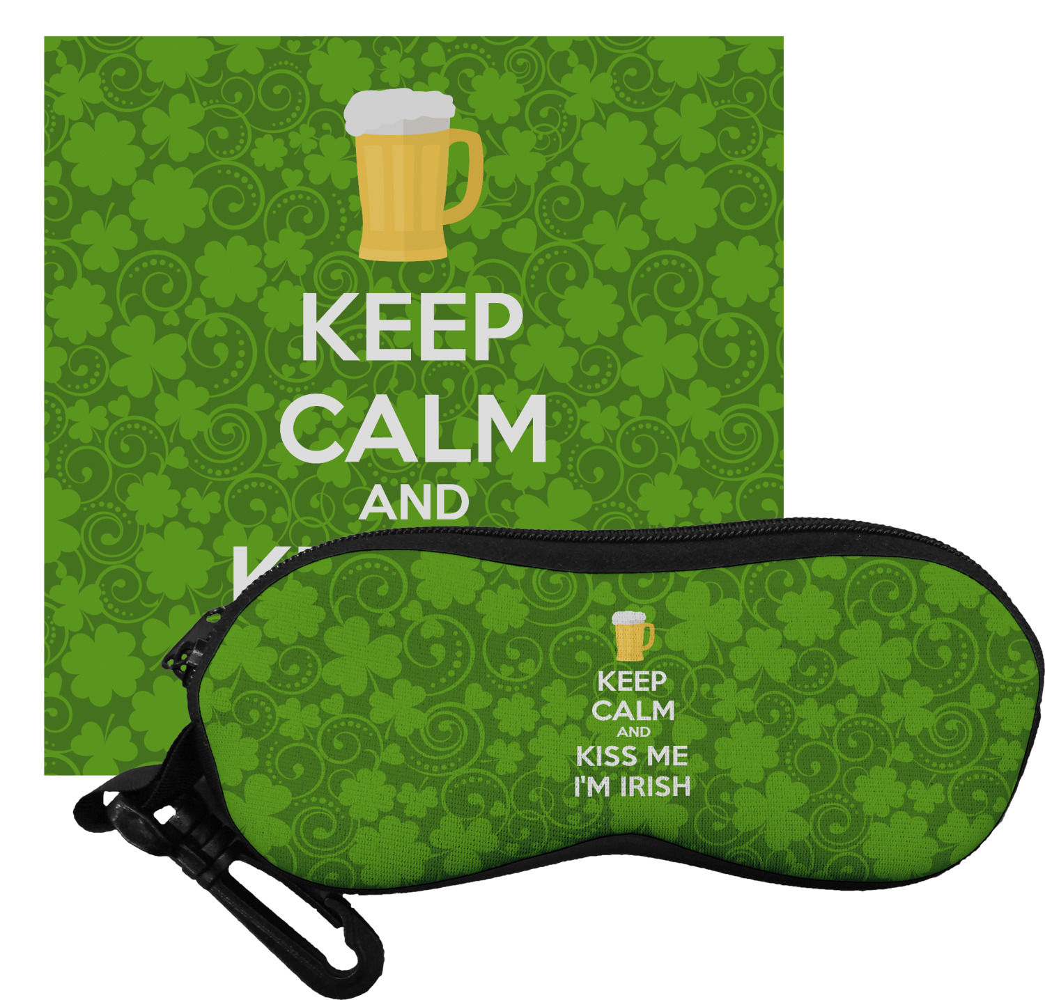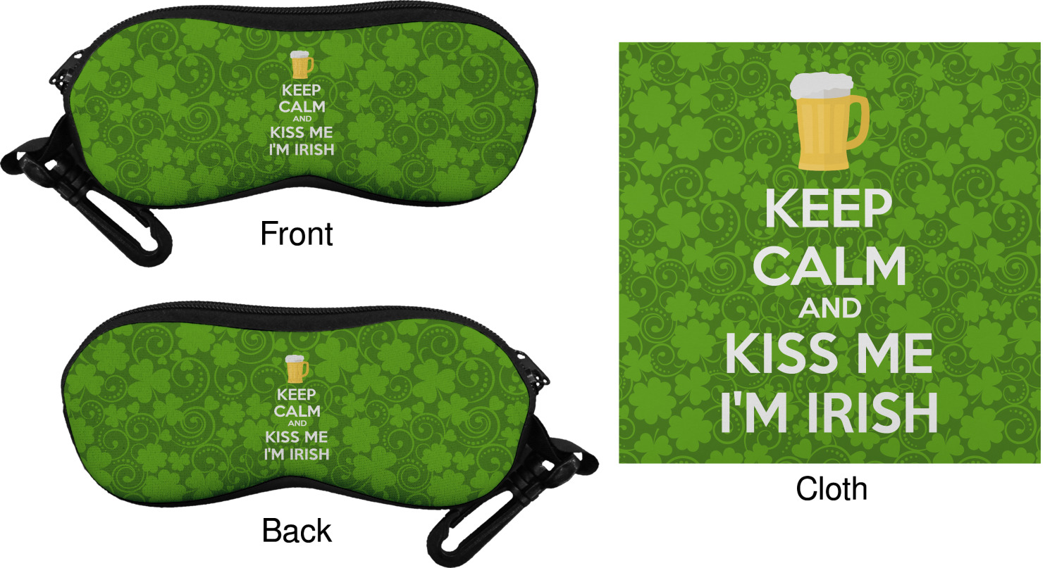 This lucky design is mostly bright green. The background has a lighter green and a darker green making up a background of clovers and swirls. The foreground is a fun phrase that says "Keep calm and kiss me I'm Irish." A fun beer graphic sits above this. You can easily personalize this phrase as well as the graphic above to be whatever you like.
