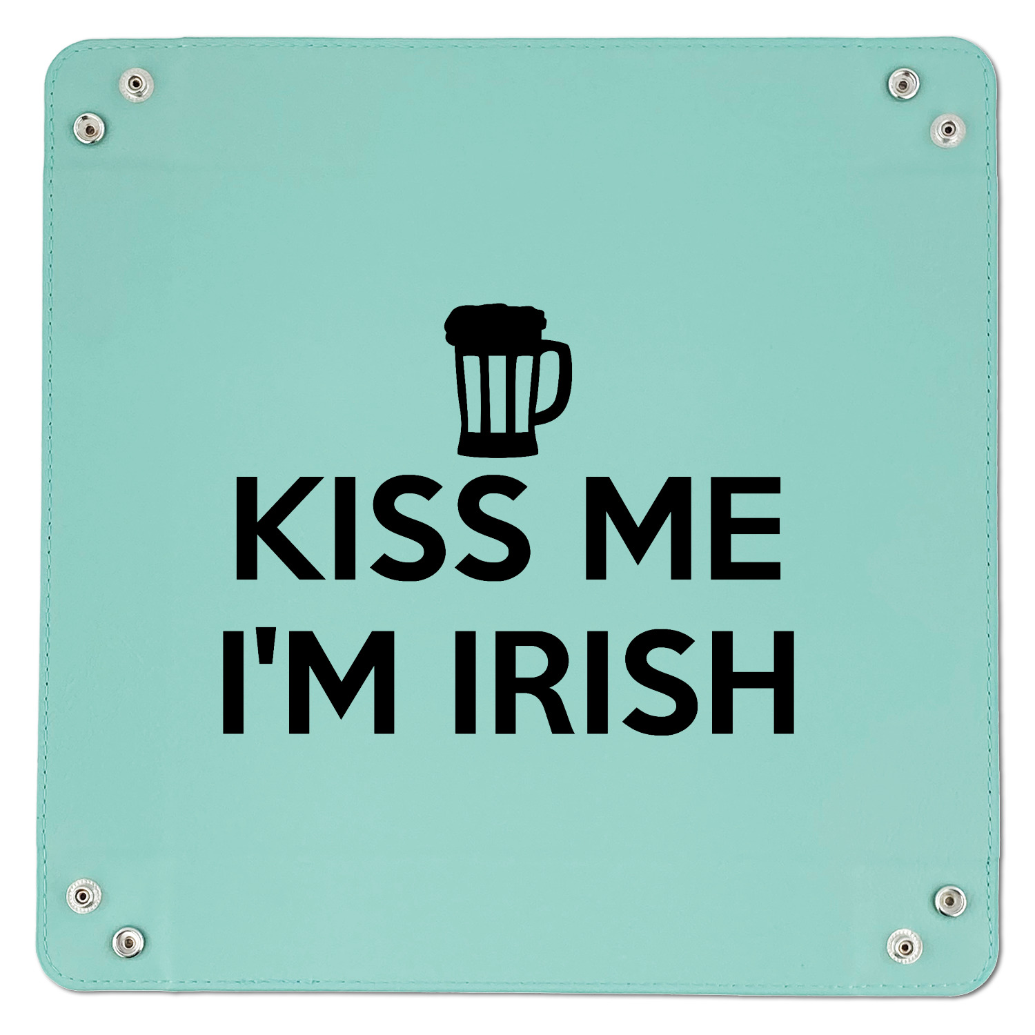 This lucky design is mostly bright green. The background has a lighter green and a darker green making up a background of clovers and swirls. The foreground is a fun phrase that says "Keep calm and kiss me I'm Irish." A fun beer graphic sits above this. You can easily personalize this phrase as well as the graphic above to be whatever you like.