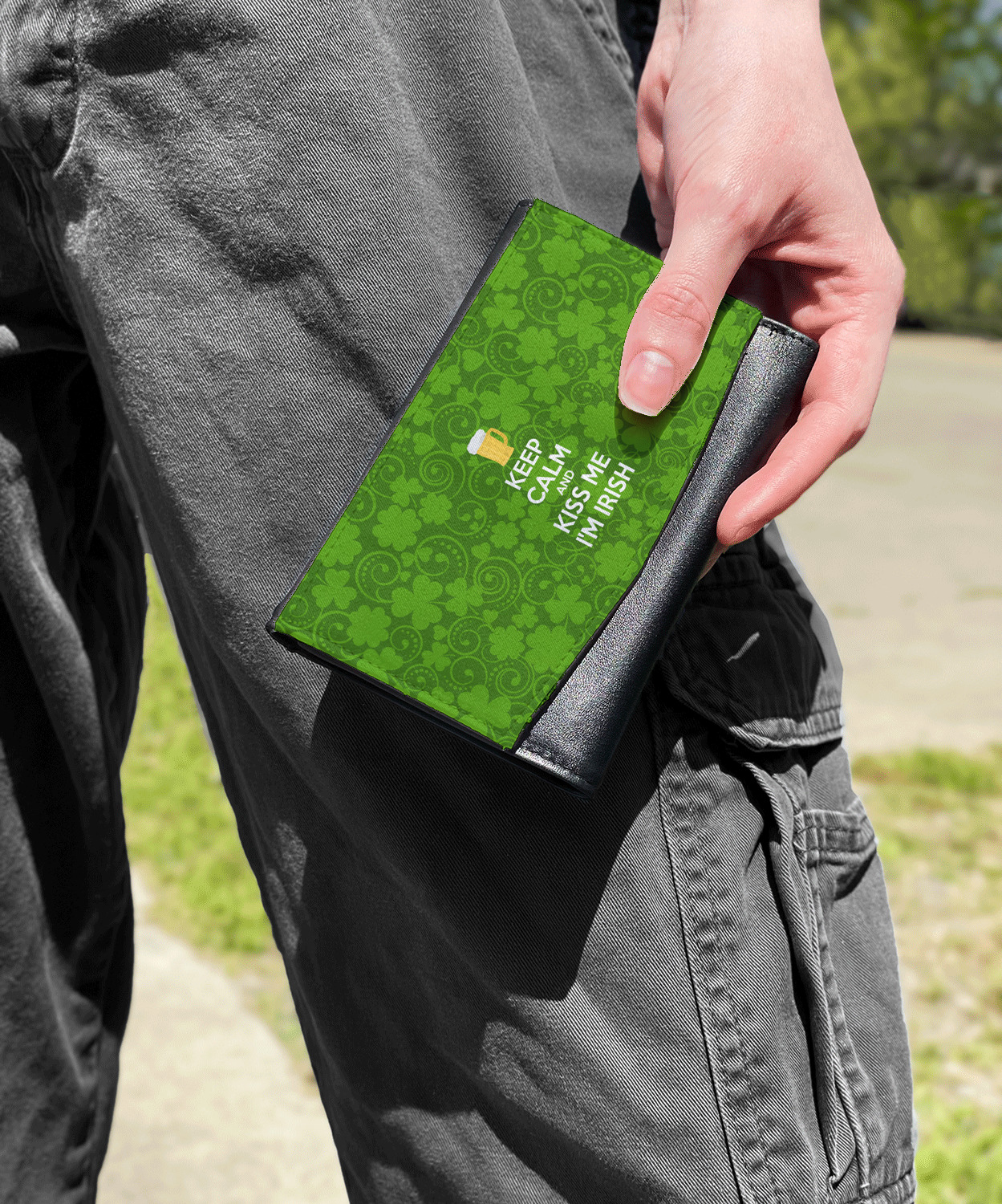 This lucky design is mostly bright green. The background has a lighter green and a darker green making up a background of clovers and swirls. The foreground is a fun phrase that says "Keep calm and kiss me I'm Irish." A fun beer graphic sits above this. You can easily personalize this phrase as well as the graphic above to be whatever you like.