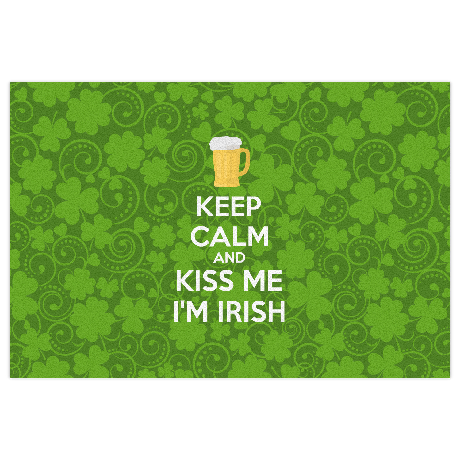 This lucky design is mostly bright green. The background has a lighter green and a darker green making up a background of clovers and swirls. The foreground is a fun phrase that says "Keep calm and kiss me I'm Irish." A fun beer graphic sits above this. You can easily personalize this phrase as well as the graphic above to be whatever you like.