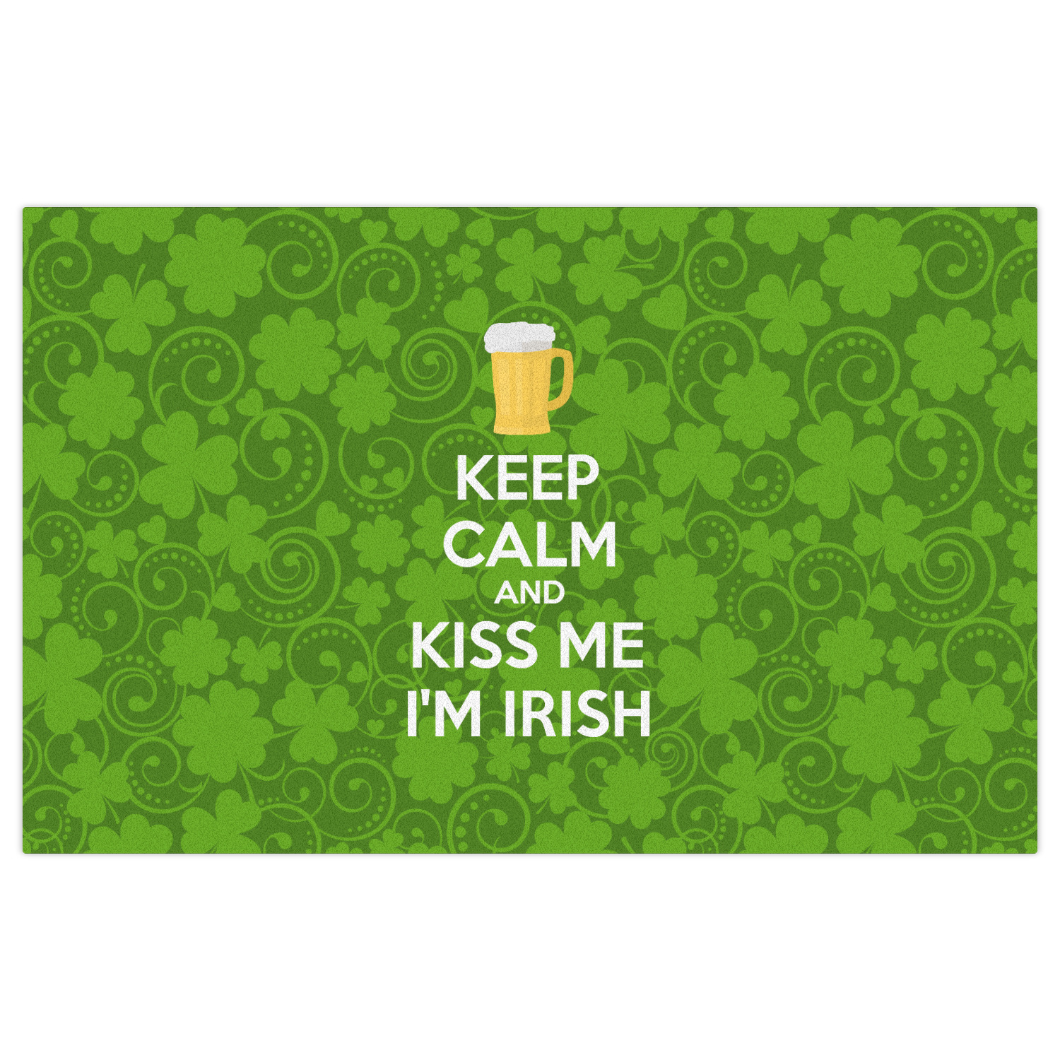 This lucky design is mostly bright green. The background has a lighter green and a darker green making up a background of clovers and swirls. The foreground is a fun phrase that says "Keep calm and kiss me I'm Irish." A fun beer graphic sits above this. You can easily personalize this phrase as well as the graphic above to be whatever you like.