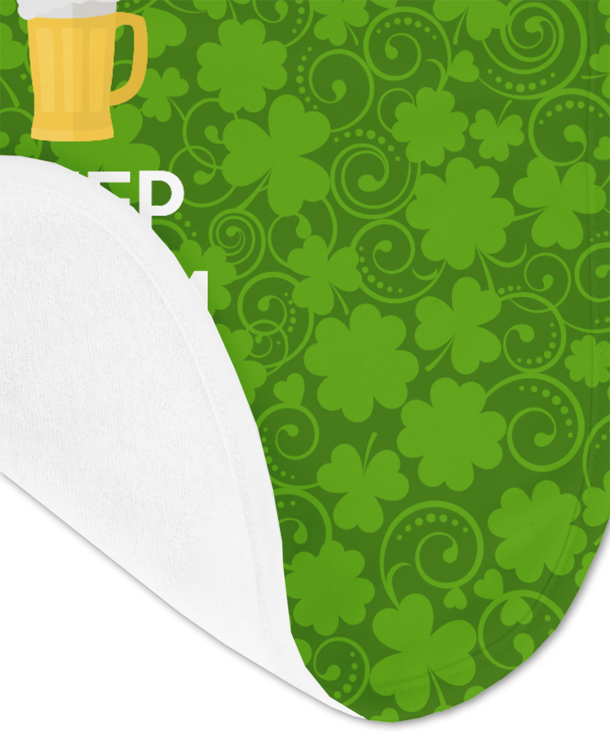 This lucky design is mostly bright green. The background has a lighter green and a darker green making up a background of clovers and swirls. The foreground is a fun phrase that says "Keep calm and kiss me I'm Irish." A fun beer graphic sits above this. You can easily personalize this phrase as well as the graphic above to be whatever you like.