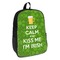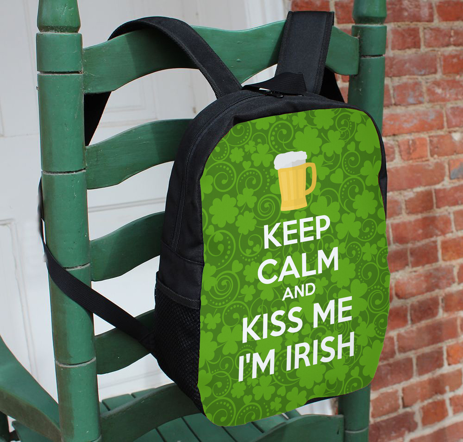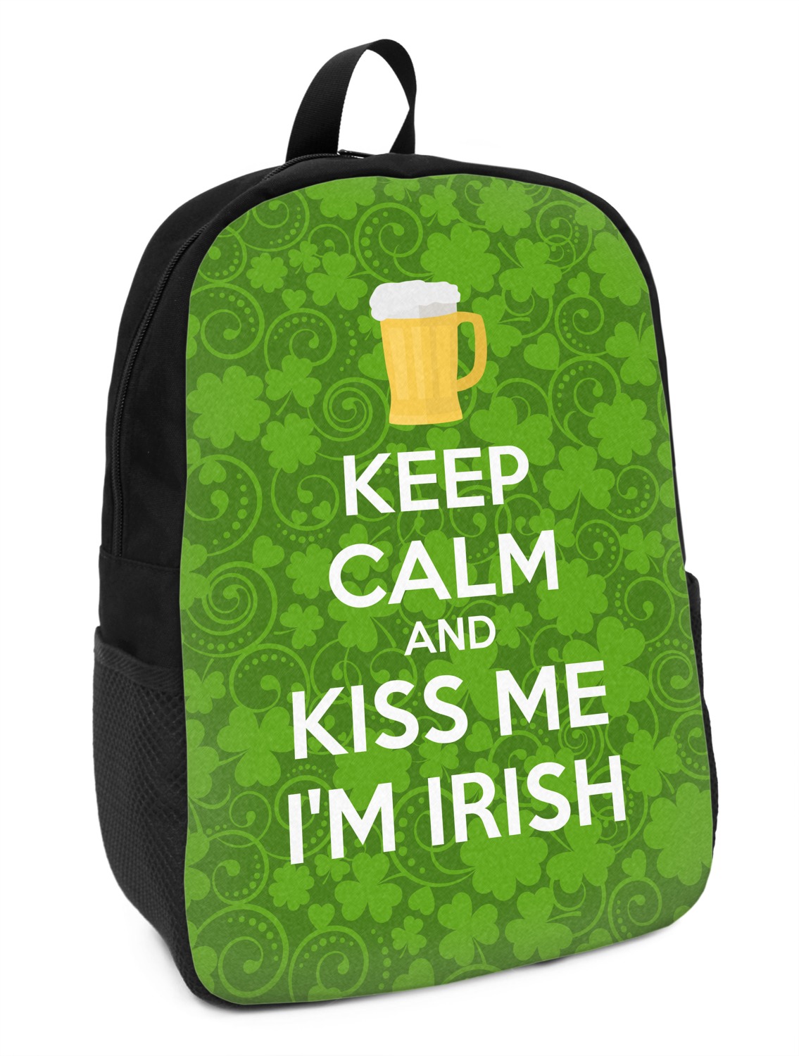 This lucky design is mostly bright green. The background has a lighter green and a darker green making up a background of clovers and swirls. The foreground is a fun phrase that says "Keep calm and kiss me I'm Irish." A fun beer graphic sits above this. You can easily personalize this phrase as well as the graphic above to be whatever you like.